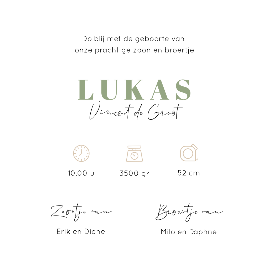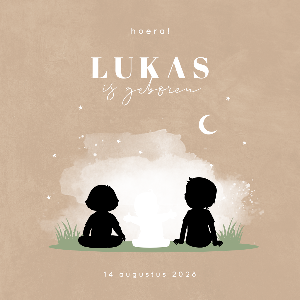 Een mooi geboortekaartje voor een derde kindje in zandkleur met hoogglans zwarte silhouetjes. Pas zelf de silhouetjes aan in onze ontwerptool, kijk in de afbeeldingenmap 'Silhouet familie' voor tientallen broertjes en zusjes. Aan de binnenzijde is ruimte voor een kort gedichtje of lieve quote en alle geboortegegevens van de kleine.