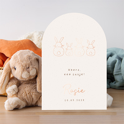Als er een vierde kindje op komst is wil je natuurlijk een heel bijzonder geboortekaartje. Dit babykaartje heeft niet alleen een bijzondere vorm met de afgeronde bovenzijde maar de vier konijntjes (symbool voor de vier kinderen) zijn gedrukt met roségoudfolie. Zo wordt het een heel speciaal kaartje.