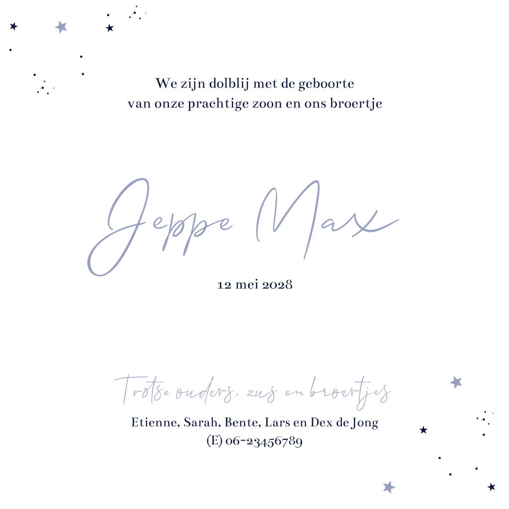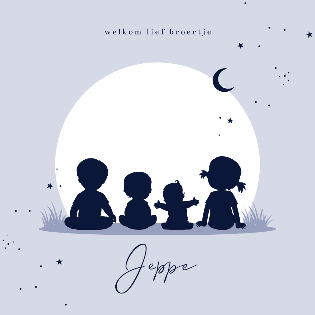 Een lief, zachtblauw geboortekaartje met vier silhouet kindjes. Kondig de komst van je zoontje aan met dit lieve ontwerp met ondergaande zon, maan en sterretjes! Liever een andere kleur of de lettertypes aanpassen? Open dit kaartje in onze handige ontwerptool en maak zelf je aanpassingen. Verander de silhouetjes zelf naar broertje of zusje met behulp van onze editor. Zoek de silhouetjes in de map 'Silhouet familie'.