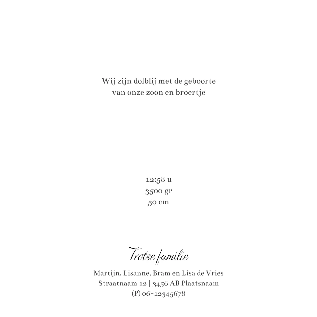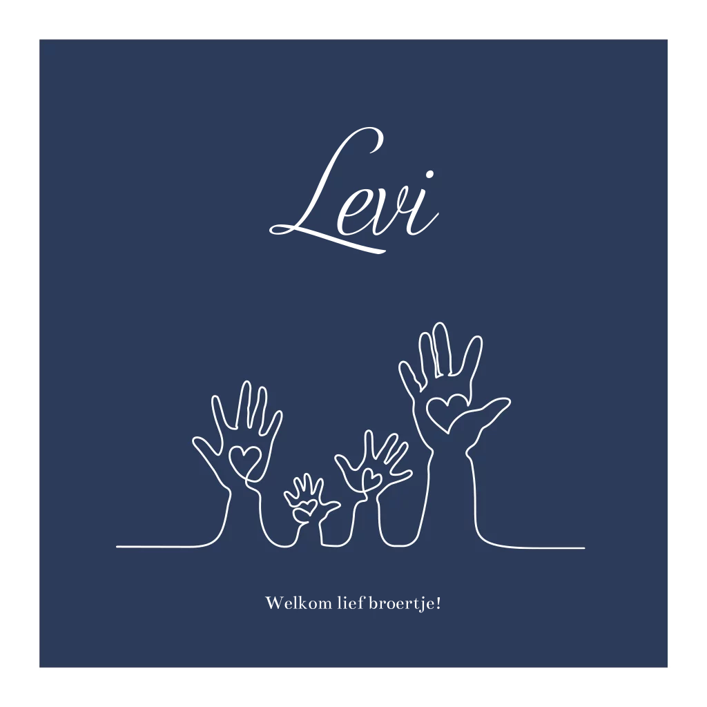 Is er een vierde kindje op komst en dit keer een jongen? Kies dan voor dit donkerblauwe geboortekaartje met vier handjes erop van alle kindjes. De illustratie is met één lijn getekend en in de handen zit ook nog een lief hartje. De naam is met goudfolie gedrukt. Zo horen alle kindjes bij elkaar en zijn ze met elkaar verbonden.