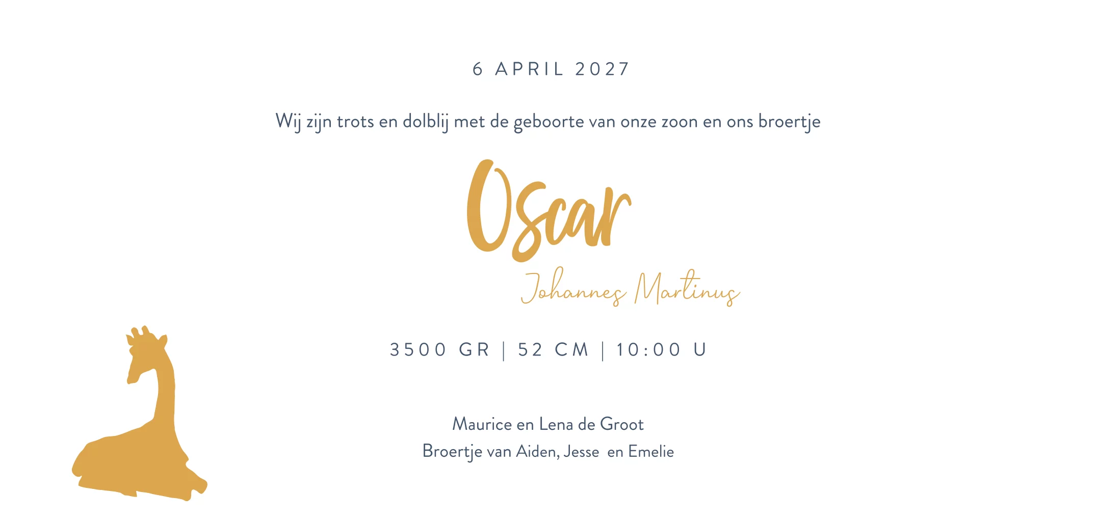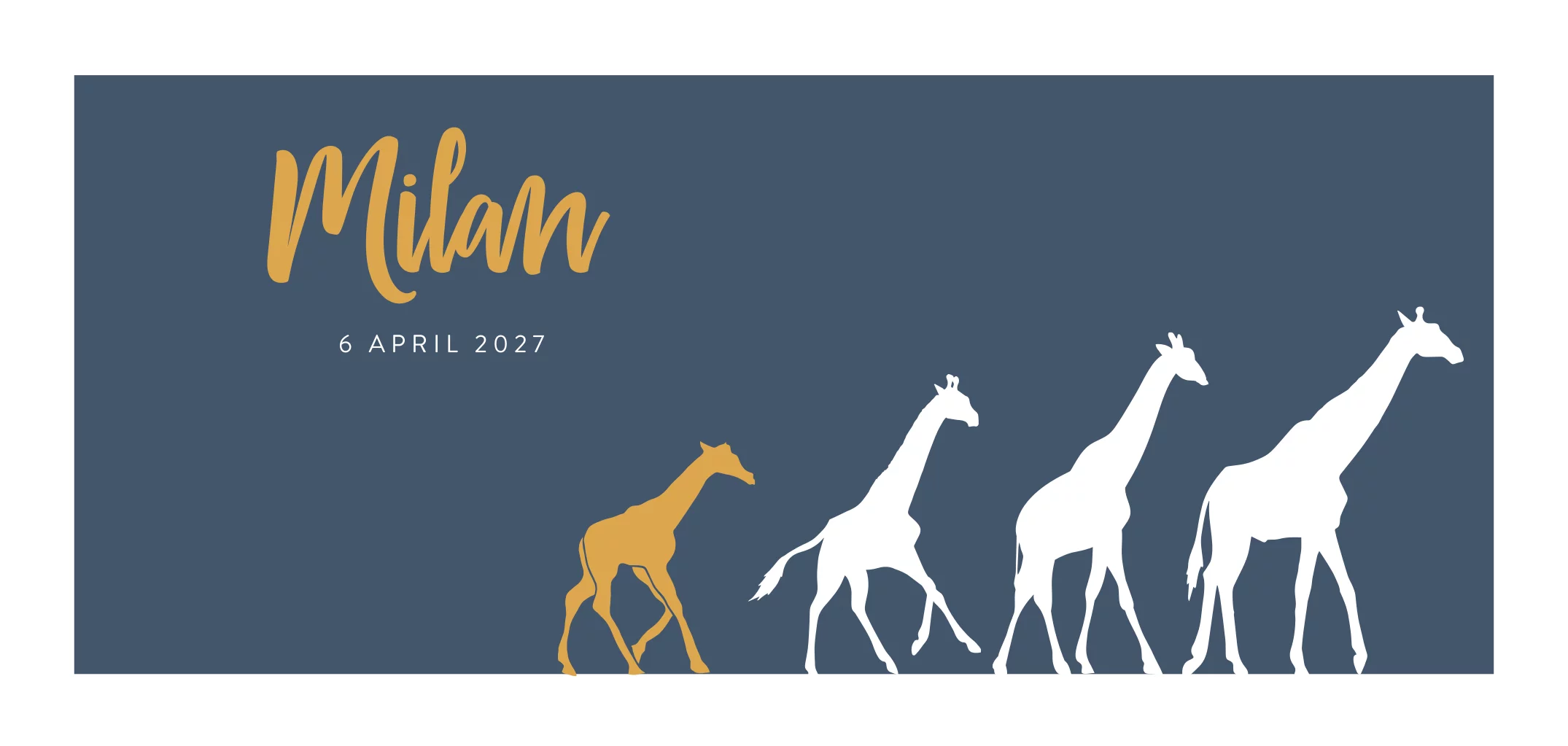 Hip geboortekaartje met donkerblauwe achtergrond, wit kader en vier girafjes op een rij van groot naar klein. Nu dit jullie 4e kindje is, is dit natuurlijk super toepasselijk! Met een vrolijk lettertype staat de naam van jullie zoontje op de kaart. Liever een ander diertje of nog een giraf toevoegen? Deze vind je terug in onze tool bij "Afbeeldingen en versieringen" in de map "Silhouet dieren".