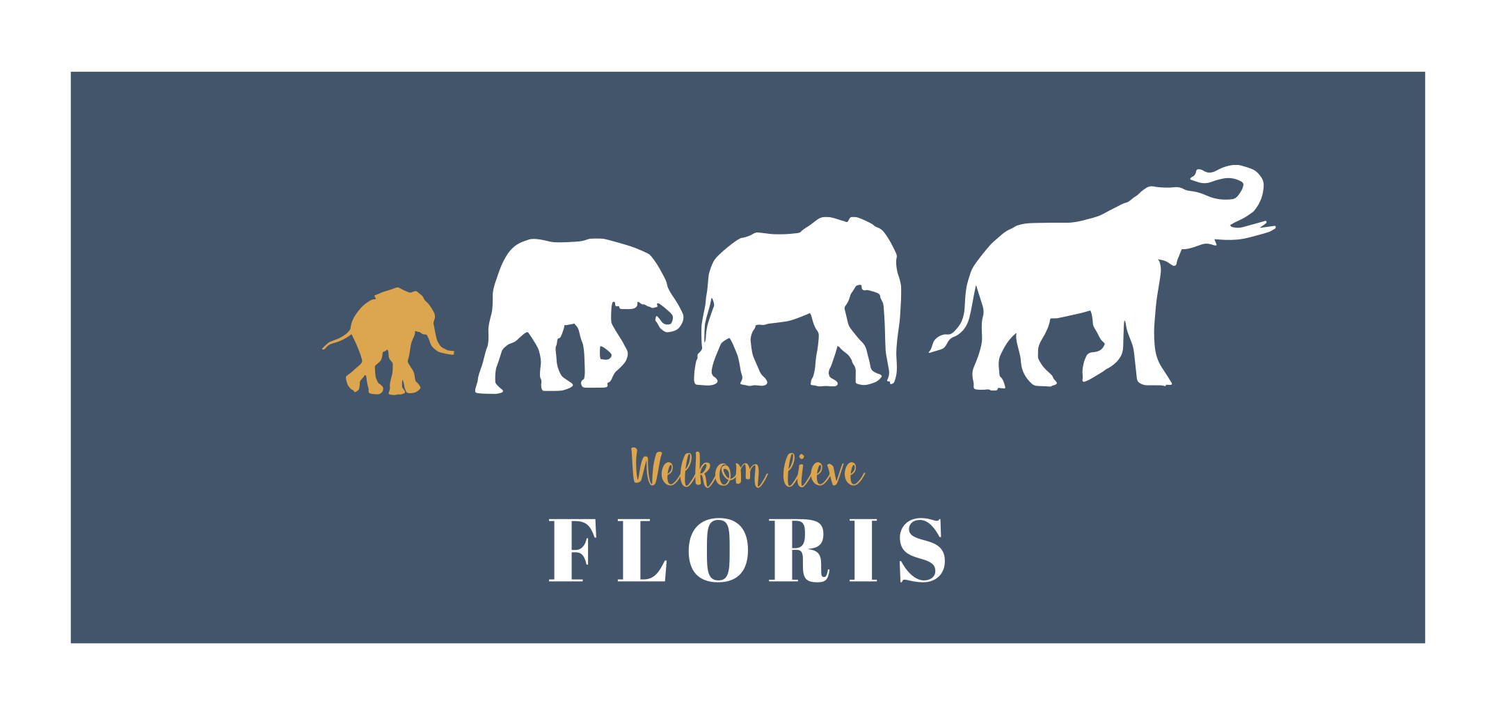 Stijlvol geboortekaartje met donkerblauwe achtergrond en wit kader. In het midden van de kaart zie je een rij met vier olifantjes van groot naar klein. En nu dit jullie 4e kindje is, is dit natuurlijk super toepasselijk!