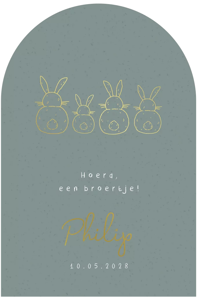 Speciaal voor de komst van een vierde kindje is dit mooie kaartje ontworpen. Vier lieve konijntjes staan centraal en staan voor de kindjes in jullie gezin. Het zachte grijsblauw en de blinkende goudfolie geven het ontwerp een chique uitstraling. De afgeronde bovenkant zorgt voor een uniek en speels accent.
