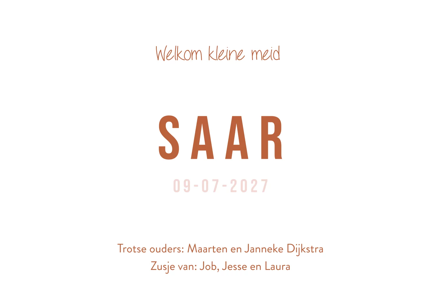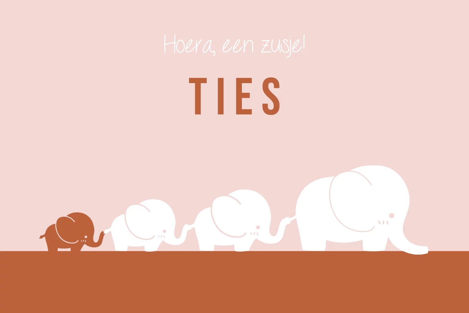 Schattig geboortekaartje met vier olifantjes op een rij, de kleinste is roestrood van kleur. Perfect voor als je een 4e kindje mag verwelkomen en wel een meisje. Pas de kaart heel simpel aan in de ontwerptool.