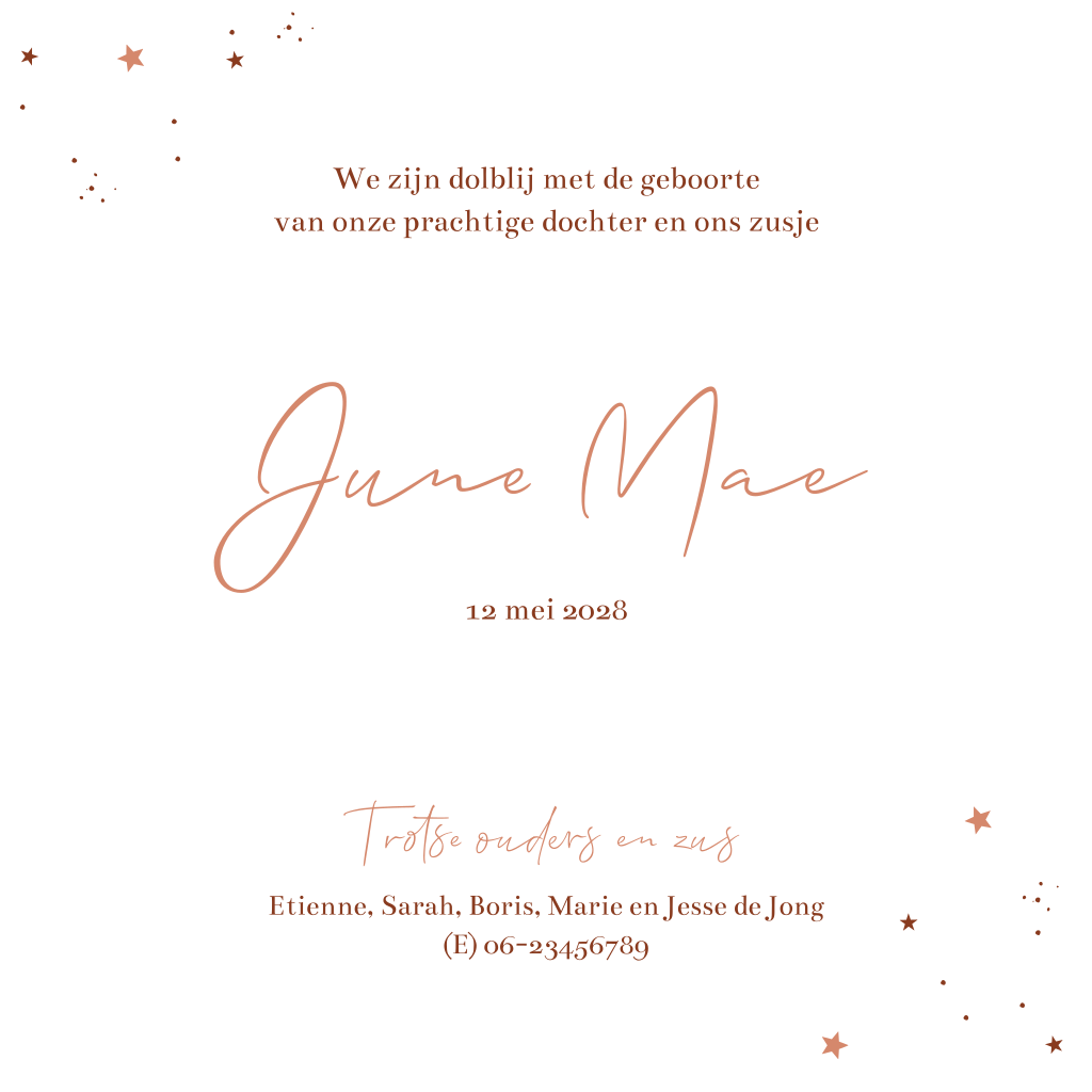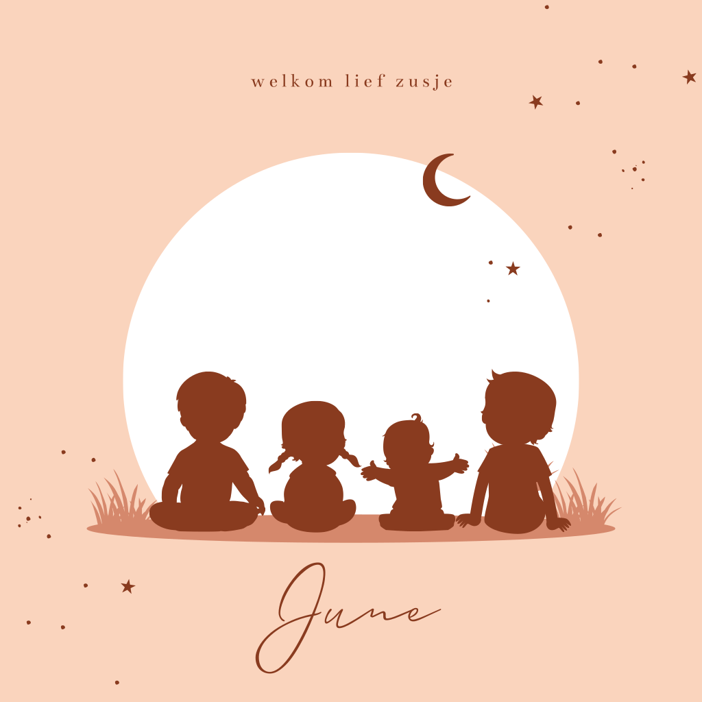 Kondig de geboorte van je vierde kindje aan met dit schttige, zalmroze geboortekaartje. Vier kindjes zitten op een rij naar een zonsondergang te kijken. De maan en sterren staan al aan de hemel. Een schattig ontwerp waarbij de grotere broertjes of zusjes ook een plekje krijgen. Verander de silhouetjes zelf naar broertje of zusje met behulp van onze editor. Zoek de silhouetjes in de map 'Silhouet familie'.