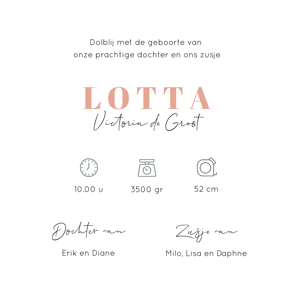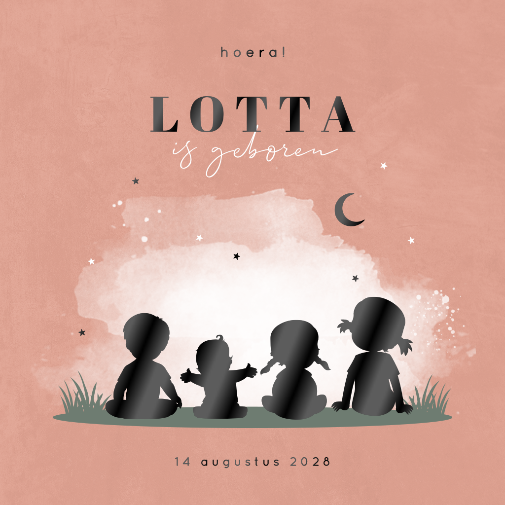 Schattig geboortekaartje voor een vierde kindje in roze kleur met hoogglans zwarte silhouetjes. Pas zelf de silhouetjes aan in onze ontwerptool, kijk in de afbeeldingenmap 'Silhouet familie' voor tientallen broertjes en zusjes. Aan de binnenzijde is ruimte voor een kort gedichtje of lieve quote en alle geboortegegevens van de kleine.