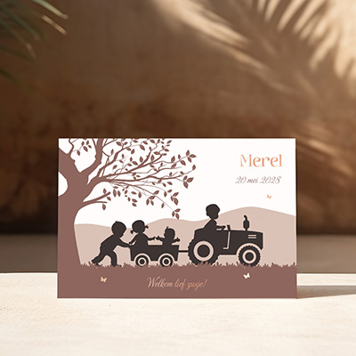 Geboortekaart voor een vierde kindje, met een illustratie van een jongen op een tractor en een karretje erachter waarin een zusje samen met het nieuwe zusje zit. Een ander broertje volgt erachter. Met de editor kun je zelf de samenstelling van de broertjes en zusjes aanpassen. Pas de kaart volledig aan en bestel een proefdruk om het ontwerp helemaal naar wens te maken.