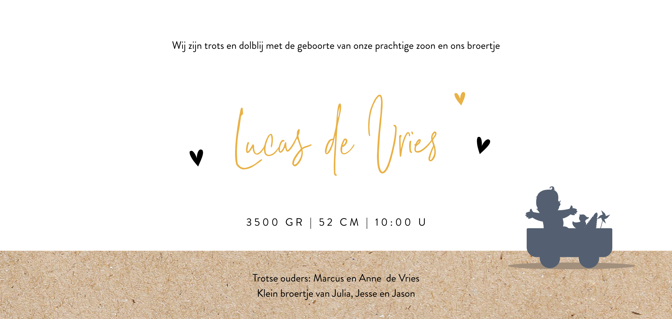 Donkerblauw silhouet geboortekaartje voor de geboorte van een vierde kindje. Je kunt de kleuren en lettertypes naar wens aanpassen. De samenstelling van de kinderen kun je uiteraard ook aanpassing naar jullie gezinssamenstelling. De illustraties vind je terug in de designtool bij "Afbeeldingen en versieringen" en dan "silhouet familie". Heb je hulp nodig? Laat het ons weten.