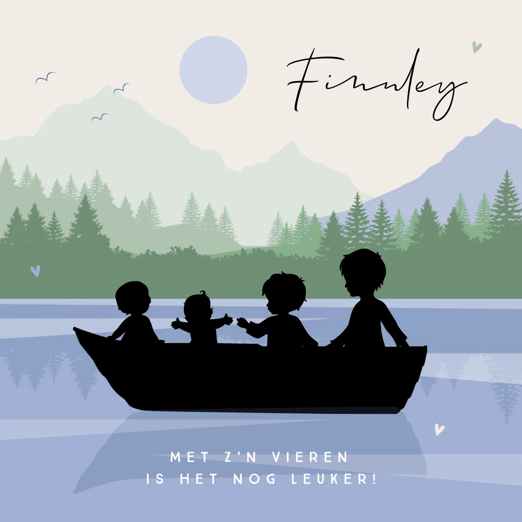 Verwachten jullie binnenkort een 4e kindje en wordt het een jongen? Ga voor dit silhouet geboortekaartje met vier kindjes in een roeibootje varend over een meer tussen de bergen en bomen. De kleuren kun je zelf wijzigen in onze handige editor.