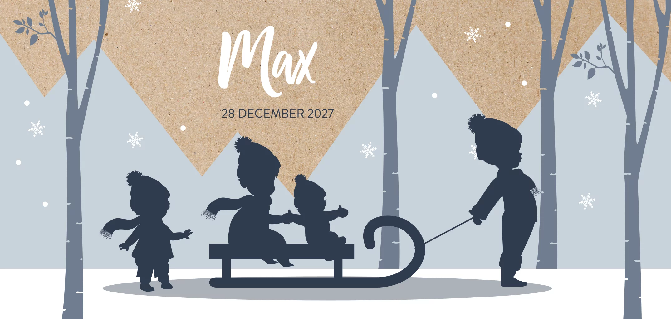 Is er een vierde kindje op komst en wordt hij in de winter verwacht? Dit leuke geboortekaartje sluit daar perfect op aan, met vier kindjes en een slee in een stoer winterlandschap. In onze tool kan de kaart makkelijk gepersonaliseerd worden. Zo kun je de samenstelling aanpassen, maar ook de kleuren en de lettertypes. Om de samenstelling aan te passen klik je op "afbeeldingen en versieringen" en vervolgens op "silhouet familie".