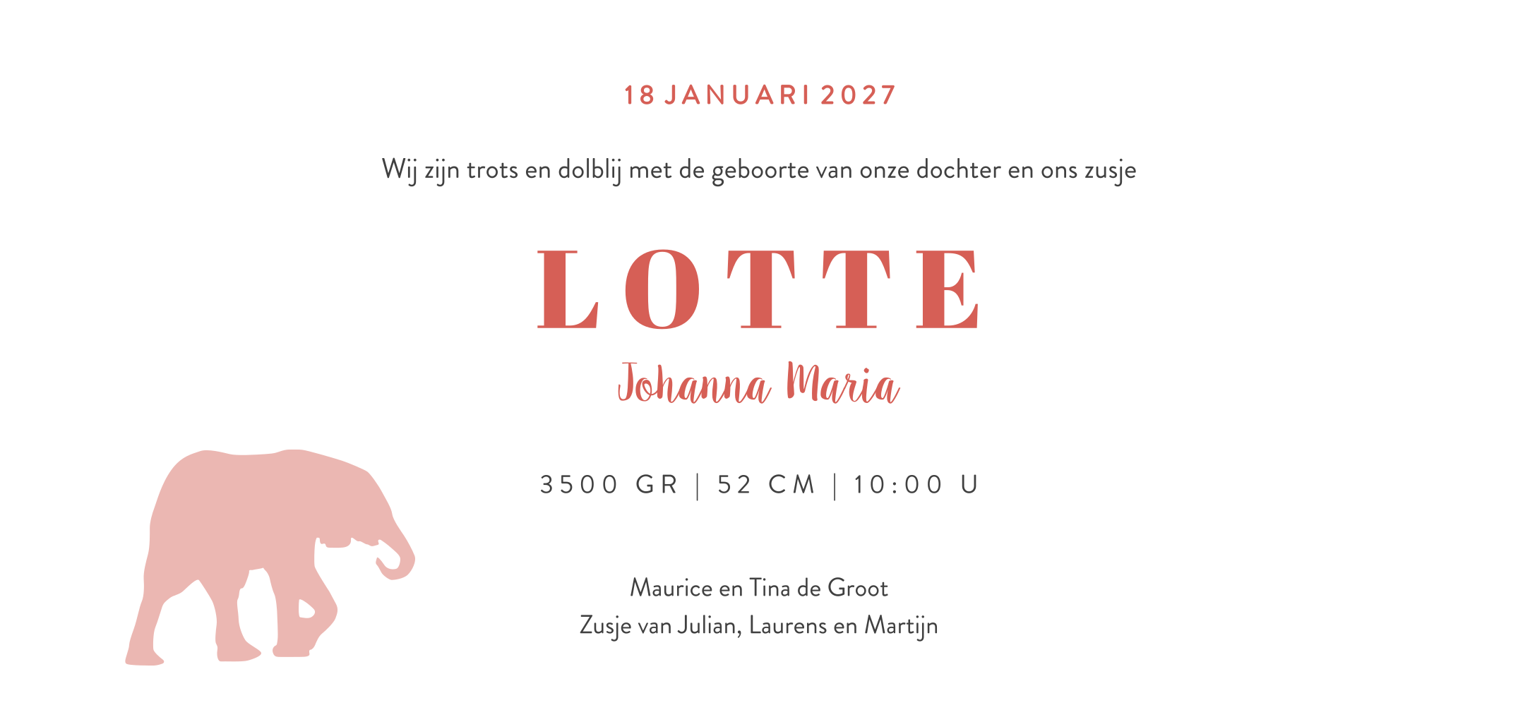 Stijlvol geboortekaartje met roze achtergrond en wit kader. Voorop de kaart lopen vier olifantjes achter elkaar van groot naar klein. En nu dit jullie 4e kindje is, is dit natuurlijk super toepasselijk!