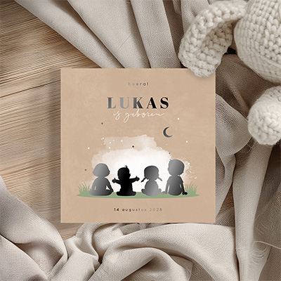 Een mooi geboortekaartje voor een vierde kindje in zandkleur met hoogglans zwarte silhouetjes. Pas zelf de silhouetjes aan in onze ontwerptool, kijk in de afbeeldingenmap 'Silhouet familie' voor tientallen broertjes en zusjes. Aan de binnenzijde is ruimte voor een kort gedichtje of lieve quote en alle geboortegegevens van de kleine.