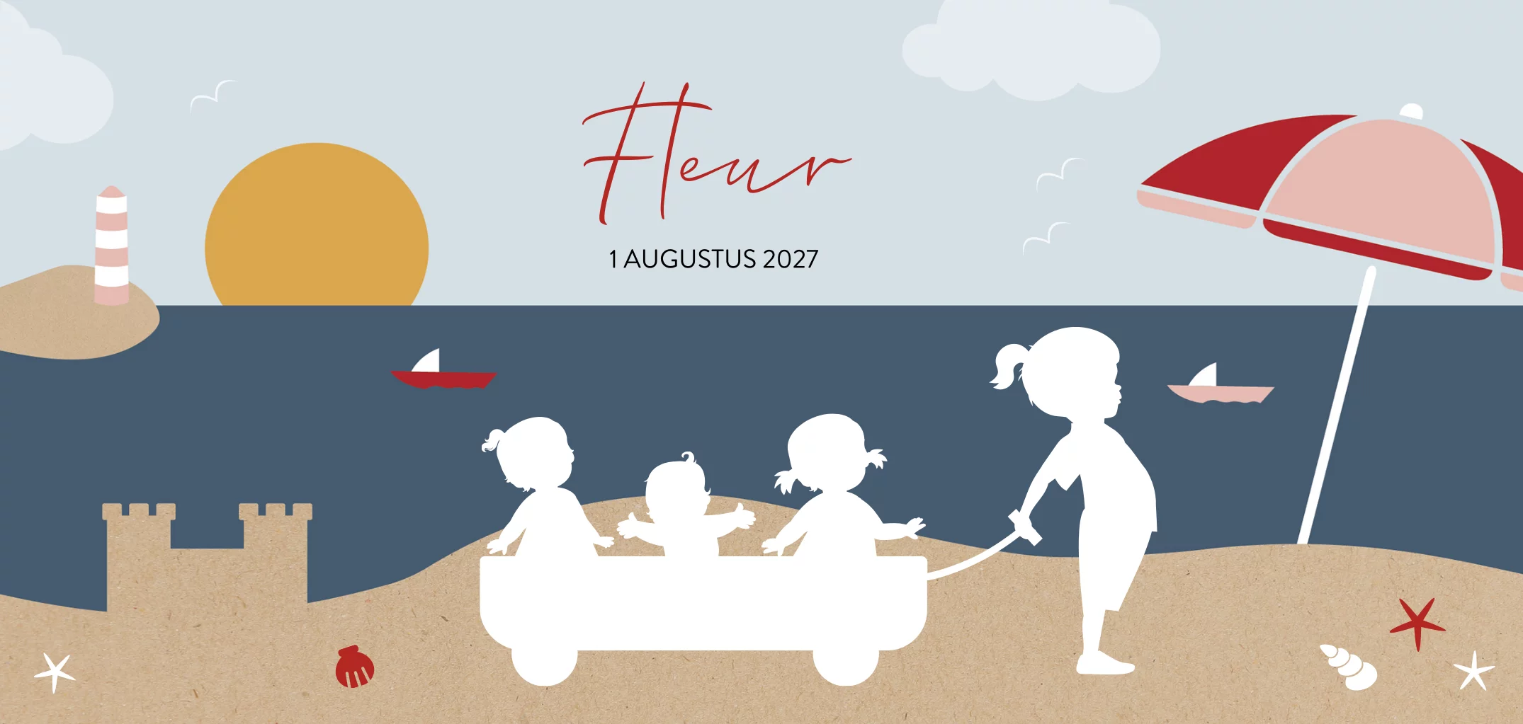 Zwanger van je vierde kindje en uitgerekend hartje zomer? Dan is dit ontwerp echt wat voor jou. Op de voorzijde zie je vier kindjes op het strand. De samenstelling kun je gemakkelijk aanpassen. De silhouetjes vind je onder de tab "silhouet familie".