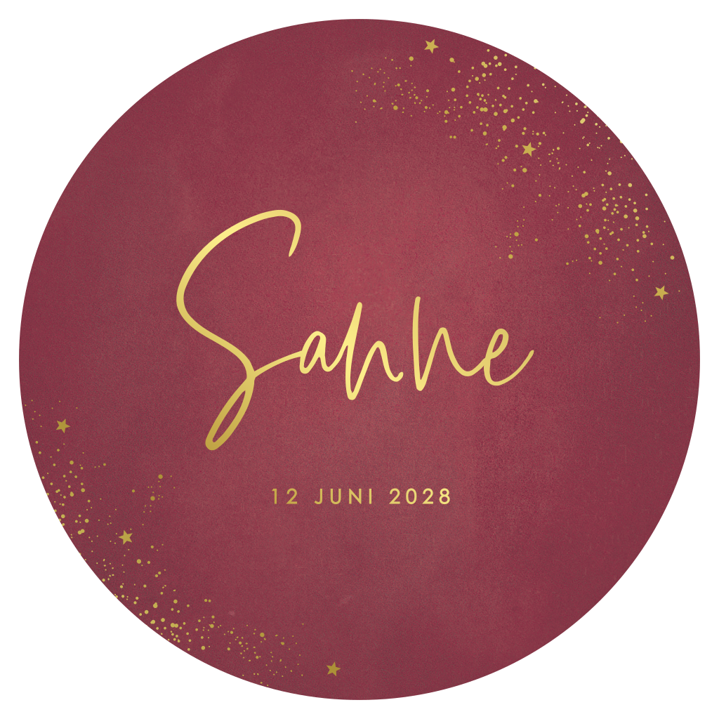 Een donkerroze geboortekaartje om de komst van je dochtertje mee aan te kondigen. De kaart heeft een ronde vorm en wordt bedrukt met goudfolie. Een origineel ontwerp dus! De sterretjes en spetters maken het geheel helemaal af. Pas het ontwerp zelf eenvoudig aan in onze ontwerptool en bestel een proefdruk.
