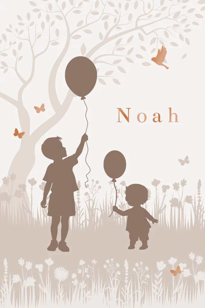 Vier de aankomst van je tweede zoontje met dit betoverende geboortekaartje. Een schattig ontwerp in beige, waar twee silhouet broertjes allebei een ballon vasthouden, omringd door bloemen, vlinders en een vogeltje. Perfect voor een klein broertje dat geboren wordt in de lente of zomer! De naam van je kleine, plus vlinders en vogel, worden in prachtig bruine hoogglans gedrukt. Vrolijk, tijdloos en lief, kondig de komst van je tweede kindje aan met dit leuke geboortekaartje! Pas dit ontwerp zelf aan in onze editor en bestel een proefdruk.