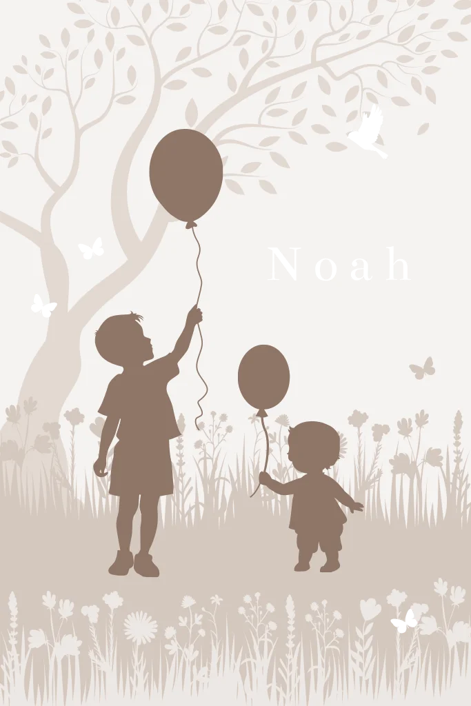 Vier de aankomst van je tweede zoontje met dit betoverende geboortekaartje. Een schattig ontwerp in beige, waar twee silhouet broertjes allebei een ballon vasthouden, omringd door bloemen, vlinders en een vogeltje. Perfect voor een klein broertje dat geboren wordt in de lente of zomer! De naam van je kleine, plus vlinders en vogel, worden in prachtig koperfolie gedrukt. Vrolijk, tijdloos en lief, kondig de komst van je tweede kindje aan met dit leuke geboortekaartje! Pas dit ontwerp zelf aan in onze editor en bestel een proefdruk.