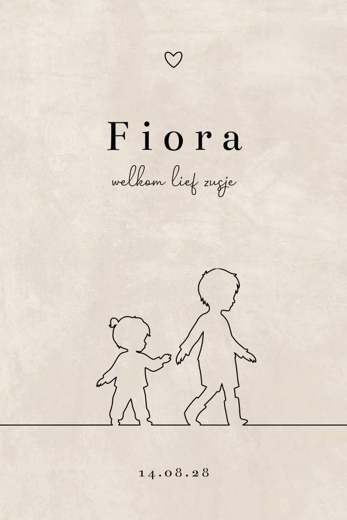 Lief en klassiek geboortekaartje voor een tweede kindje met lijntekeningen van silhouet broer en zusje op een rustige, beige achtergrond. Liever een andere kleur of de achtergrond aanpassen? Geef je eigen draai aan dit geboortekaartje met onze handige ontwerptool.
