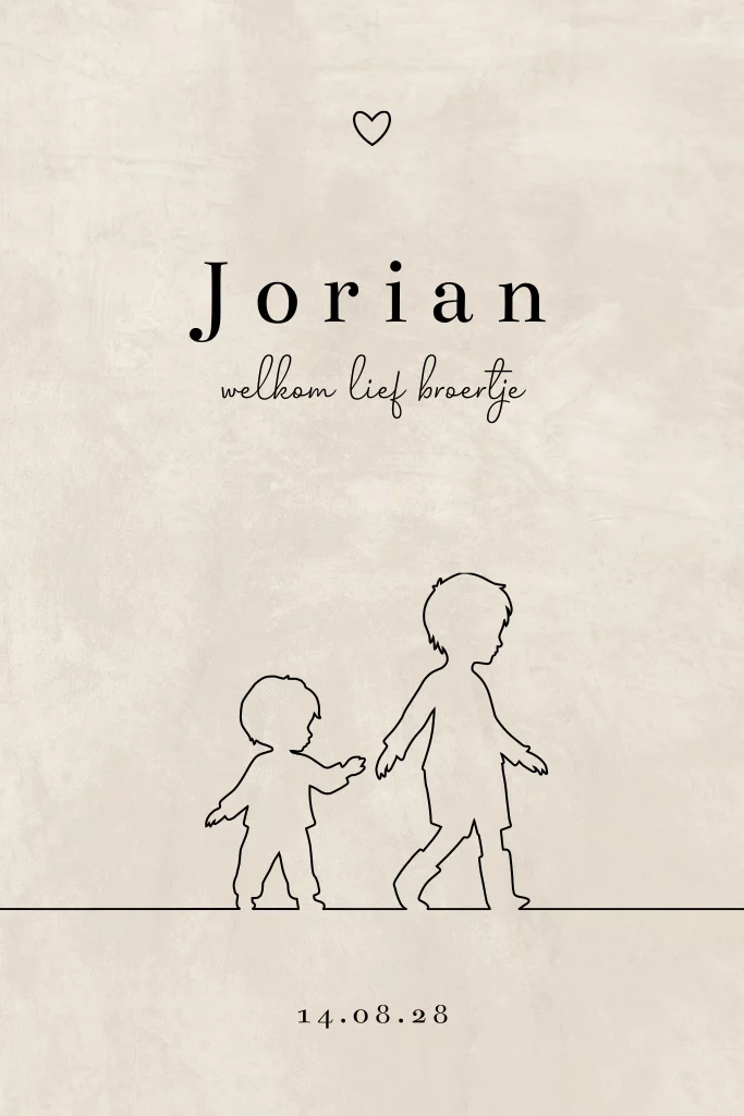 Lief en klassiek geboortekaartje voor een klein broertje met lijntekeningen van silhouet broers op een rustige, beige achtergrond. Liever een andere kleur of de achtergrond aanpassen? Geef je eigen draai aan dit geboortekaartje met onze handige ontwerptool.