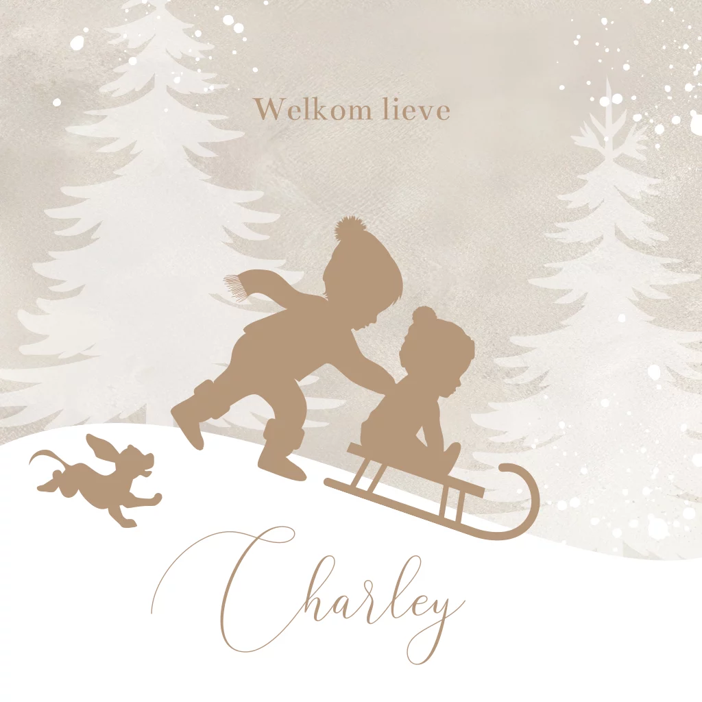 Breng de magie van de winter tot leven met dit sfeervolle geboortekaartje met een silhouet van een grote broer die een slee voortduwt, met daarop zijn pasgeboren broertje of zusje. Op de achtergrond staan besneeuwde bomen, terwijl zachte sneeuwvlokken het geheel een knusse wintersfeer geven. De hippe beige tinten maken dit kaartje perfect voor zowel jongens als meisjes. Voeg een persoonlijke touch toe en bestel eenvoudig een proefdruk!