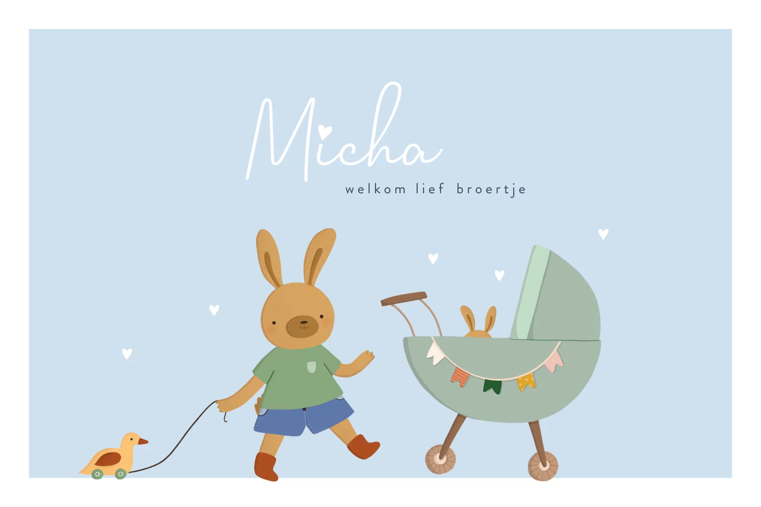 Blauw geboortekaartje voor een 2e kindje met twee konijnen broertjes. U heeft reeds een zoon en er is een tweede zoon op komst, wat bijzonder! Kondig dit blijde nieuws aan met dit lieve geboortekaartje met getekende konijntjes. Het oudere broertje duwt de kinderwagen met daarin zijn baby broertje vooruit. Een vrolijk en lieflijk ontwerp, vind je ook niet? Bestel een eerste proefdruk om te kunnen zien hoe dit geboortekaartje er gedrukt uit komt te zien.