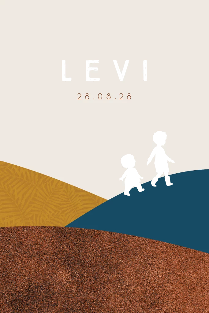 Uniek geboortekaartje voor een tweede zoon met een modern ontwerp. Het abstracte landschap in aardetinten bruin, okergeel en diepblauw vormt de achtergrond waar de oudste broer liefdevol voorop loopt, gevolgd door zijn babybroertje. Een bijzonder ontwerp dat de band tussen broers symboliseert. Personaliseer dit kaartje eenvoudig in onze handige kaartenmaker en maak het helemaal naar wens.
