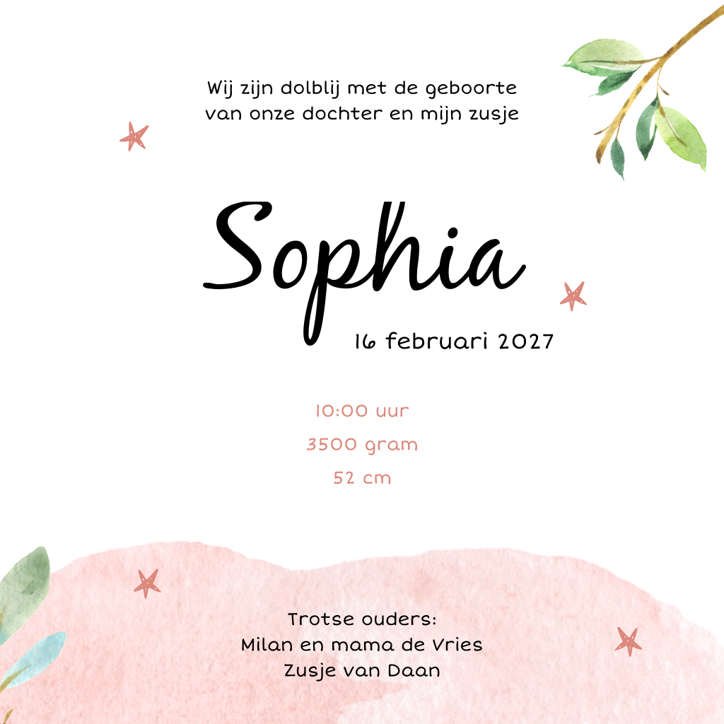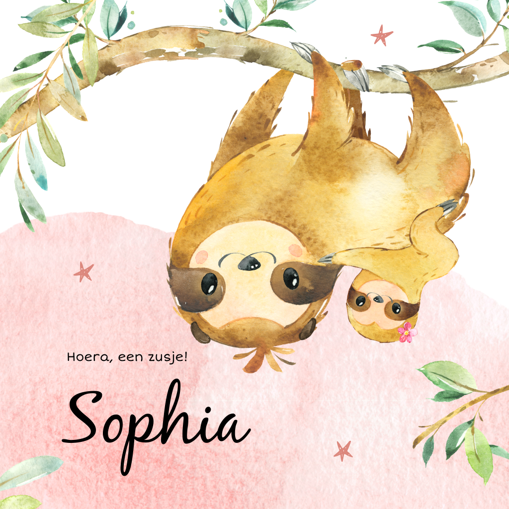 Botanisch geboortekaartje met grote luiaard en baby luiaard op z'n rug hangend aan een tak van een boom. Schattig geboortekaartje met roze waterverf. Leuke geboortekaartje om de komst van een tweede kindje mee aan te kondigen. De kaart is verder versierd met kleine sterren. Met een hip lettertype staat de naam van je pasgeboren dochter voorop de kaart. In de kaart is ruimte voor een mooie oneliner en alle geboortegegevens.