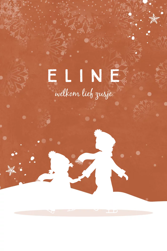 Leuk, roestbruin geboortekaartje met winters thema voor een tweede kindje. Voorop schaatsen een klein silhouet meisje en haar grote broer in prachtig, glimmend roségoudfolie. Sneeuwvlokjes dwarrelen om hen heen en ook de naam van je tweede kindje komt in glinsterend folie op dit winterse ontwerp te staan. Kondig de komst van je winterkindje aan in stijl! Een ander lettertype of de silhouetjes aanpassen? Geef je eigen creatieve draai aan dit lieve ontwerp met behulp van onze handige editor. Bestel een proefdruk om het resultaat in het echt te kunnen zien.