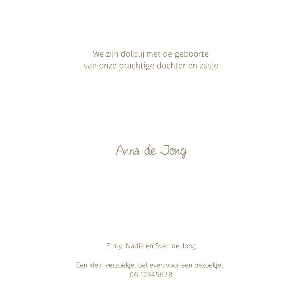 Vrolijk geboortekaartje met een silhouet van een grote broer op de bakfiets met zijn kleine zusje voorin. Op de achtergrond zie je een boom, heuvels en een konijntje in zachte natuurtinten. De kaart is ideaal voor de geboorte van een tweede kindje en kan volledig aangepast worden in de kaartenmaker.