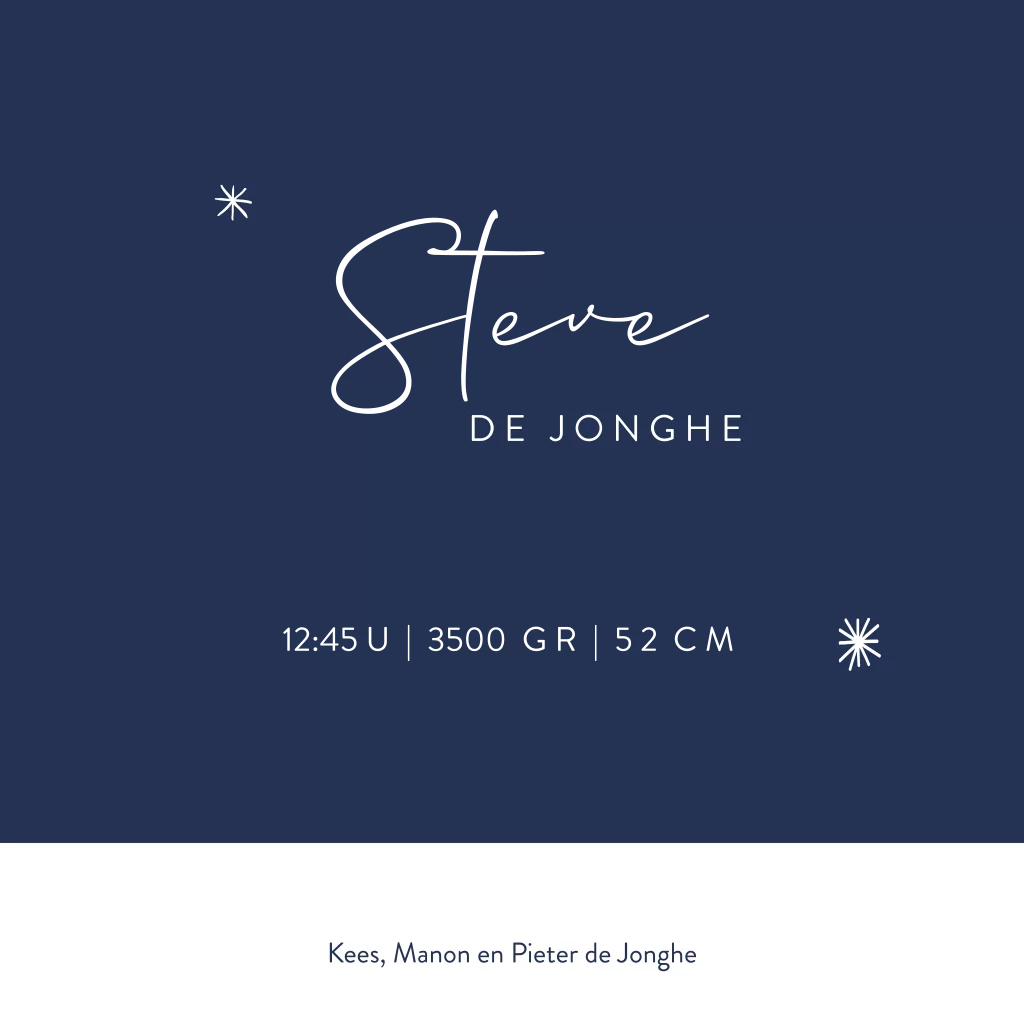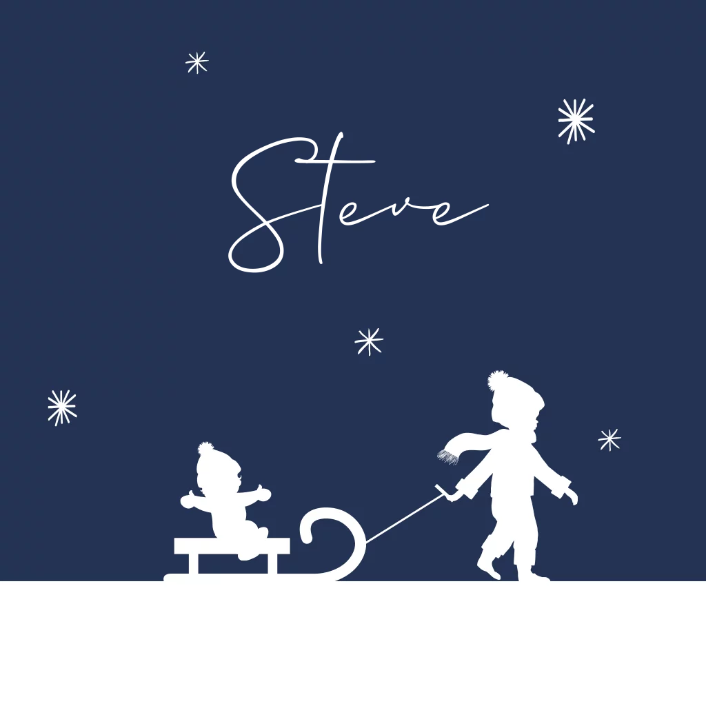 Stijlvol geboortekaartje met winterse uitstraling. De donkerblauwe kaart heeft een witte silhouet illustratie van twee broertjes. Een grote broer die een slee voorttrekt met daarop zijn pasgeboren baby broertje. Bovenaan de kaart staat de naam van je zoontje met sierlijke letters gedrukt in goudfolie. Witte sneeuwvlokjes maken het ontwerp helemaal af. Pas het ontwerp aan in de designtool en bestel een drukproef om de kaarten in het echt te bekijken.