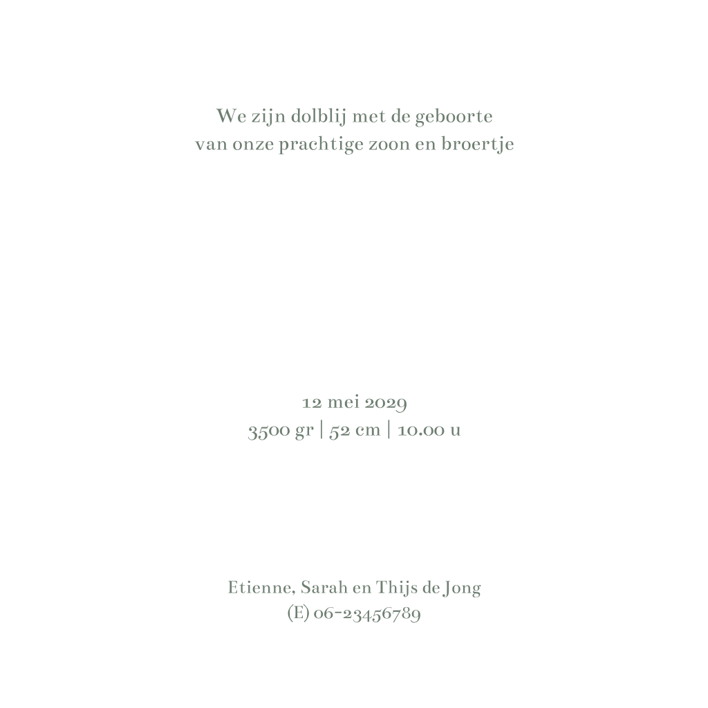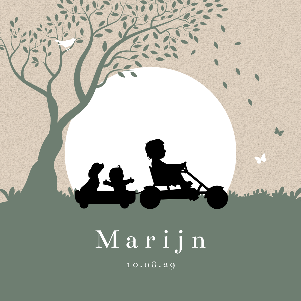 Is er een tweede kindje op komst? Kondig zijn geboorte aan met dit leuke geboortekaartje met baby, grote broer en hondje op een skelter. Ze rijden door een landschap met een boom en kleine vlindertjes. Liever een kat? Kijk eens in onze uitgebreide editor voor meer silhouetjes. Ook de kleuren kun je zelf eenvoudig wijzigen. De naam van je zoontje komt in goudfolie letters onder de silhouetjes.