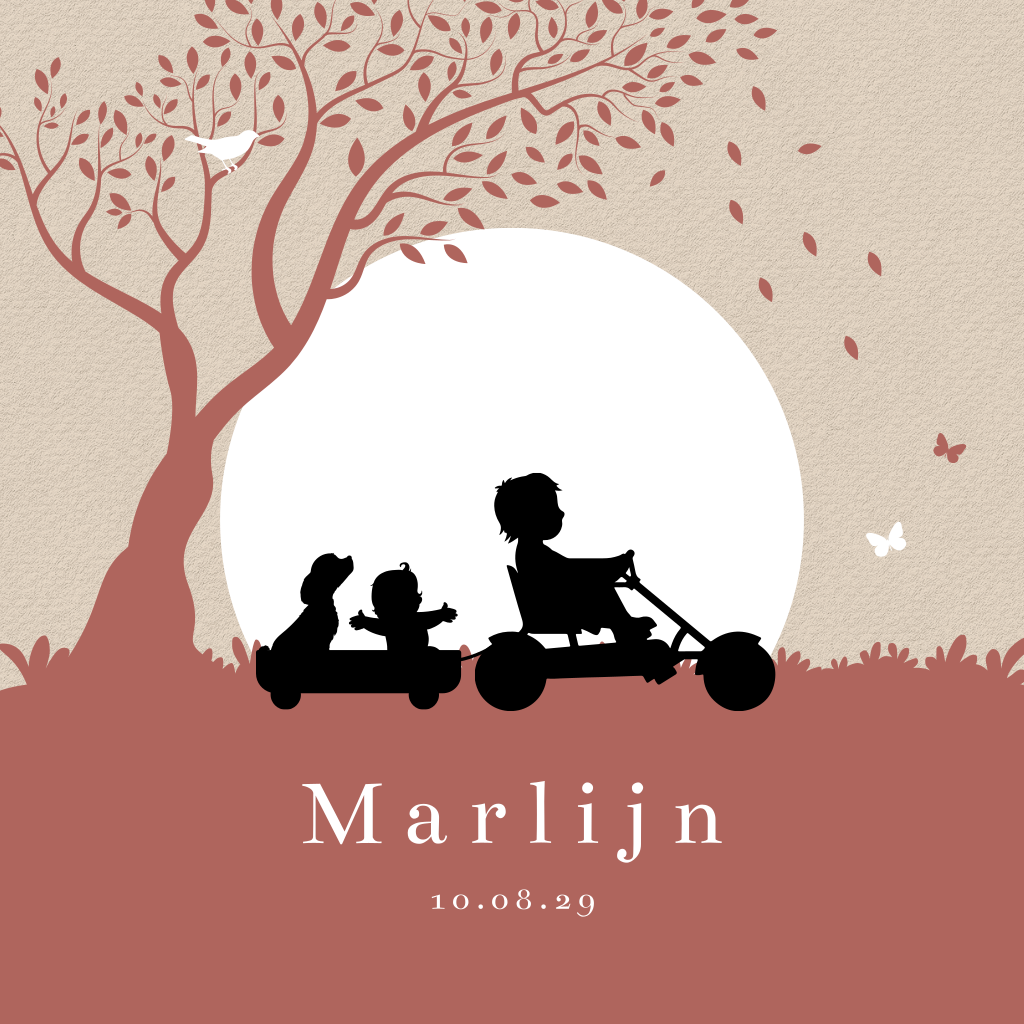 Is er een tweede kindje op komst? Kondig haar geboorte aan met dit leuke geboortekaartje met baby, grote broer en hondje op een skelter. Ze rijden door een landschap met een boom en kleine vlindertjes. Liever een kat? Kijk eens in onze uitgebreide editor voor meer silhouetjes. Ook de kleuren kun je zelf eenvoudig wijzigen. De naam van je dochtertje komt in goudfolie letters onder de silhouetjes.