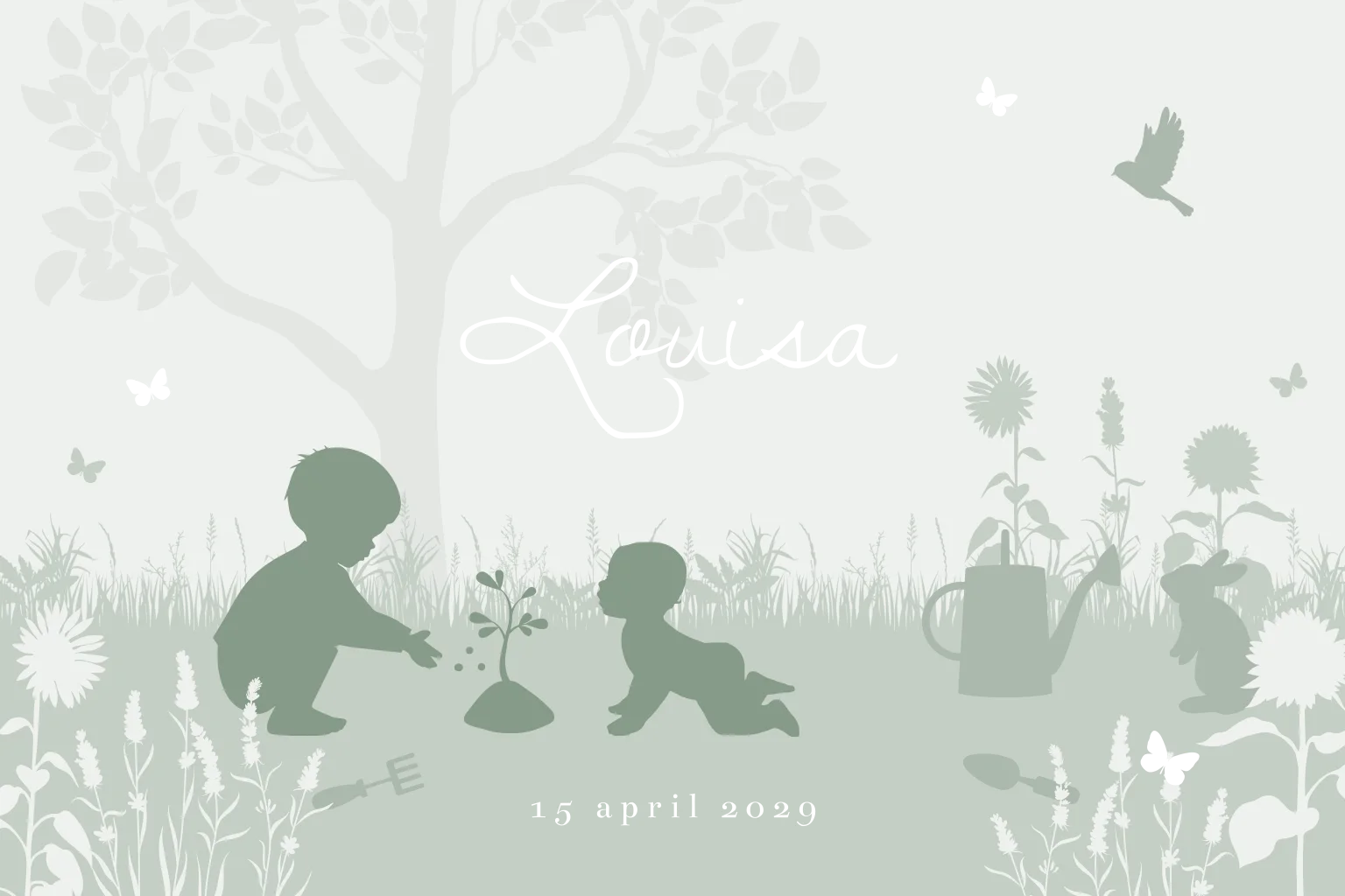 Verwelkom je tweede kindje met dit vrolijke, groene silhouet geboortekaartje! Een grote broer en kleine zus, een weelderige tuin vol bloemen en een schattig konijntje komen tot leven in zachte beige kleuren en subtiele koperfolie accenten. Het grote broertje plant een nieuw plantje, een prachtige weerspiegeling van het nieuwe leven dat nu gevierd mag worden. Het kleine zusje kijkt nieuwsgierig toe. Perfect voor een lente- of zomerkindje! Pas dit ontwerp aan in onze handige editor en bestel een proefdruk.