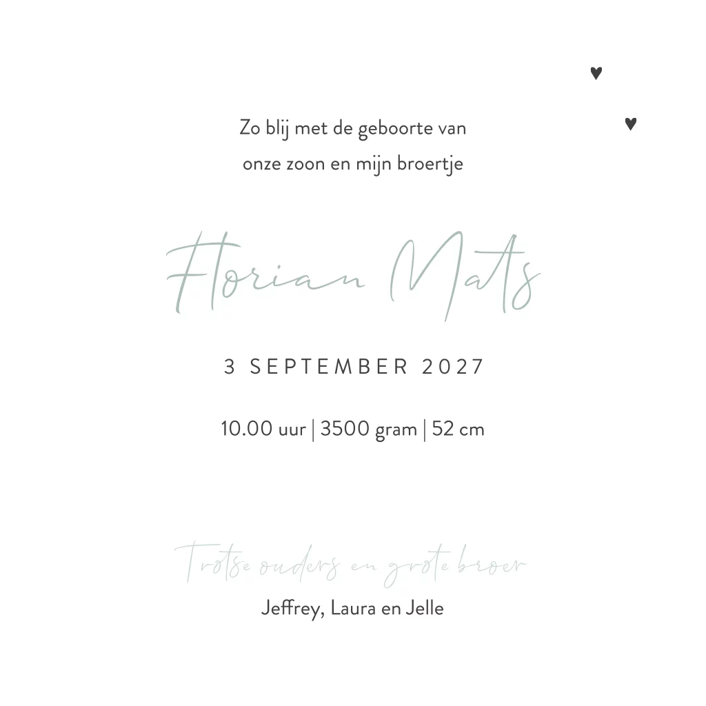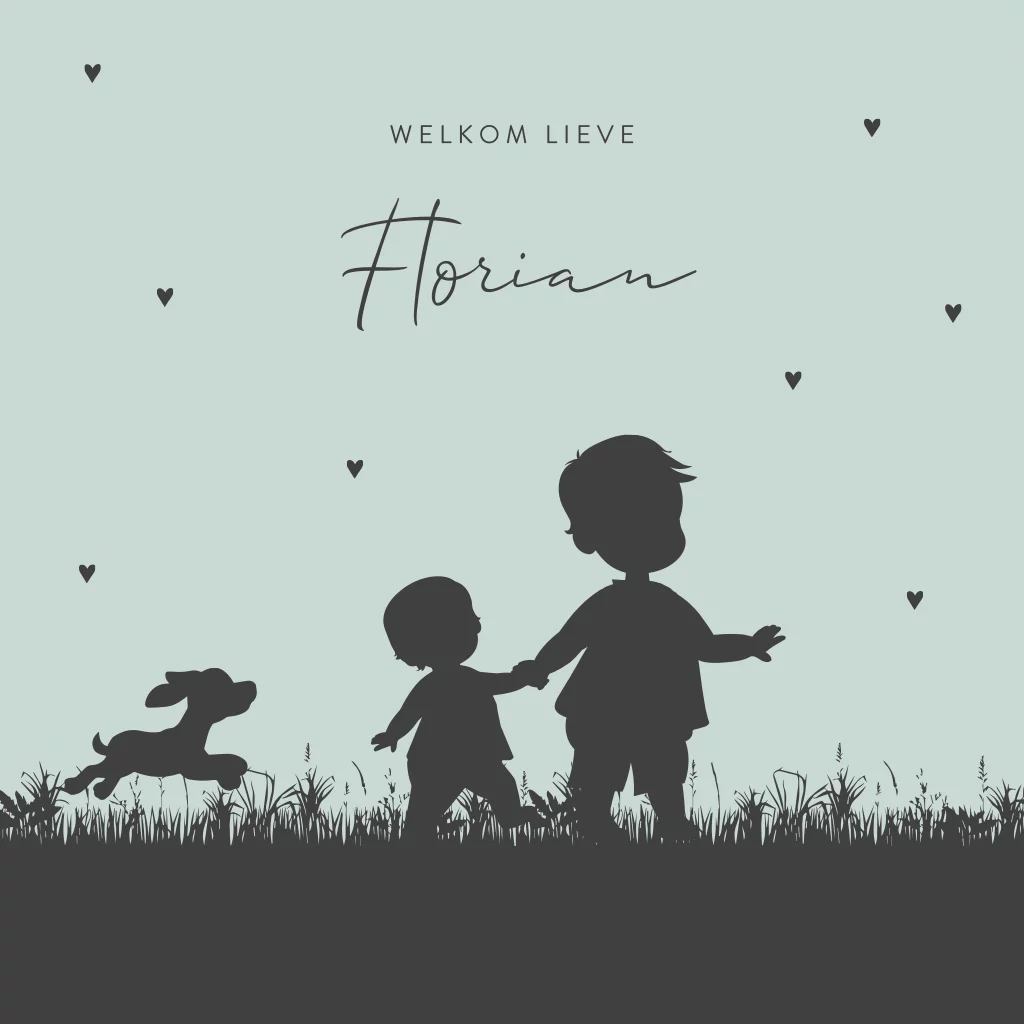 Dit schattige geboortekaartje toont een prachtig silhouet van een grote broer die liefdevol hand in hand loopt met zijn pasgeboren broertje. De eenvoudige maar stijlvolle details maken dit kaartje perfect om de komst van jullie zoontje aan te kondigen. Personaliseer het kaartje naar wens in onze editor en bestel een proefdruk om het eindresultaat te bewonderen.