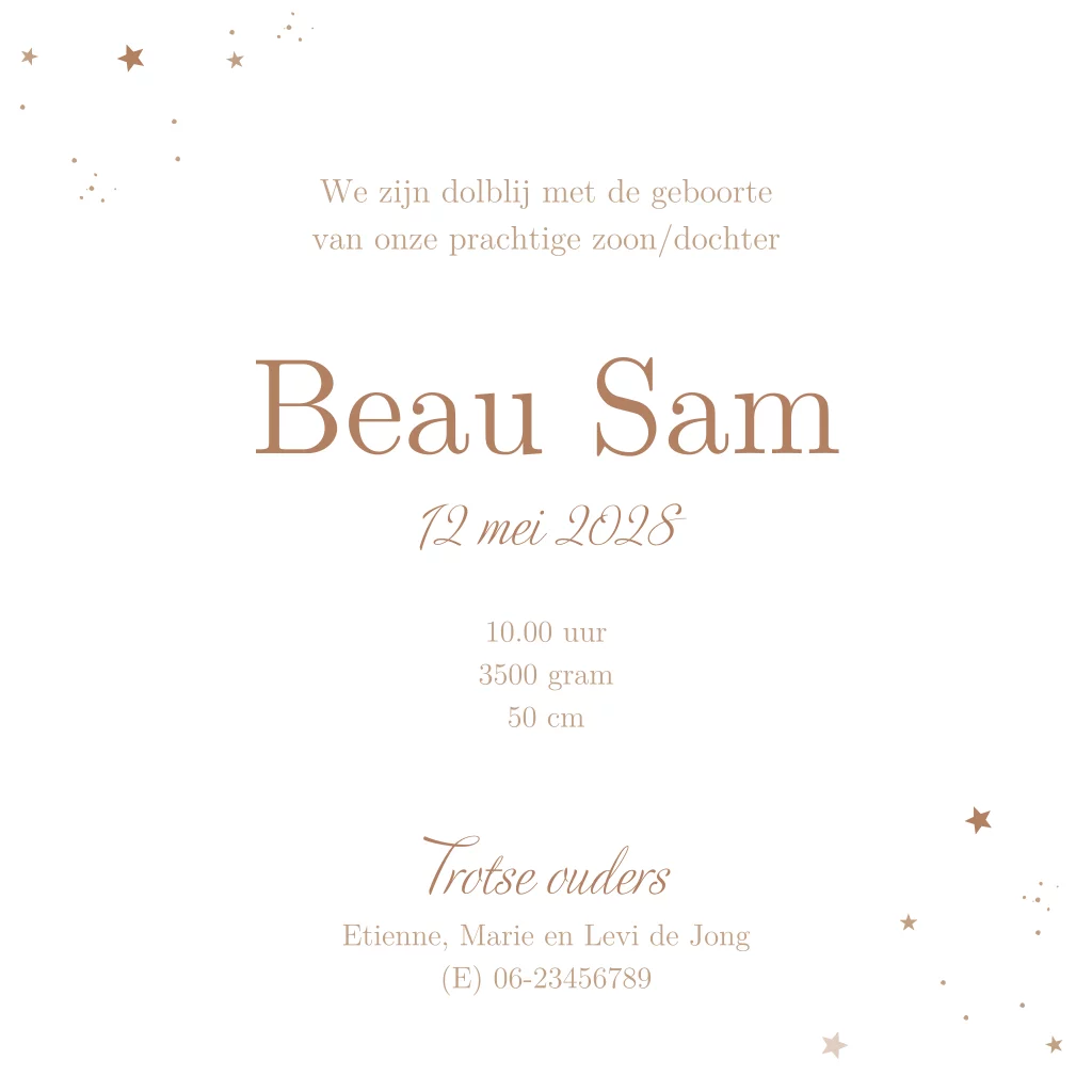 Dit geboortekaartje voor een tweede kind heeft een moderne en minimalistische look. Het silhouet toont een grote broer die naar de baby reikt, met op de achtergrond een volle maan en een rustige beige tint. Kleine sterretjes geven het ontwerp een speels detail. Door de neutrale kleuren past dit kaartje bij zowel voor de geboorte aankondiging van een jongen als een meisje. Personaliseer eenvoudig en bestel een proefdruk!