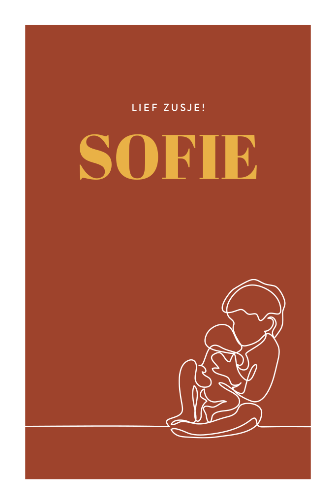 Geboortekaartje broertje met baby zusje in één lijn getekend. Prachtig geboortekaartje voor de aankondiging van een 2e kindje. Heb je een zoon en is er een meisje op komst? Dan is dit een smaakvol geboortekaartje met een 'oneline' tekening van een jongen die een baby vasthoudt. In de hippe en trendy kleur roestrood. Pas zelf de teksten, lettertype en kleuren aan en bestel een drukproef.