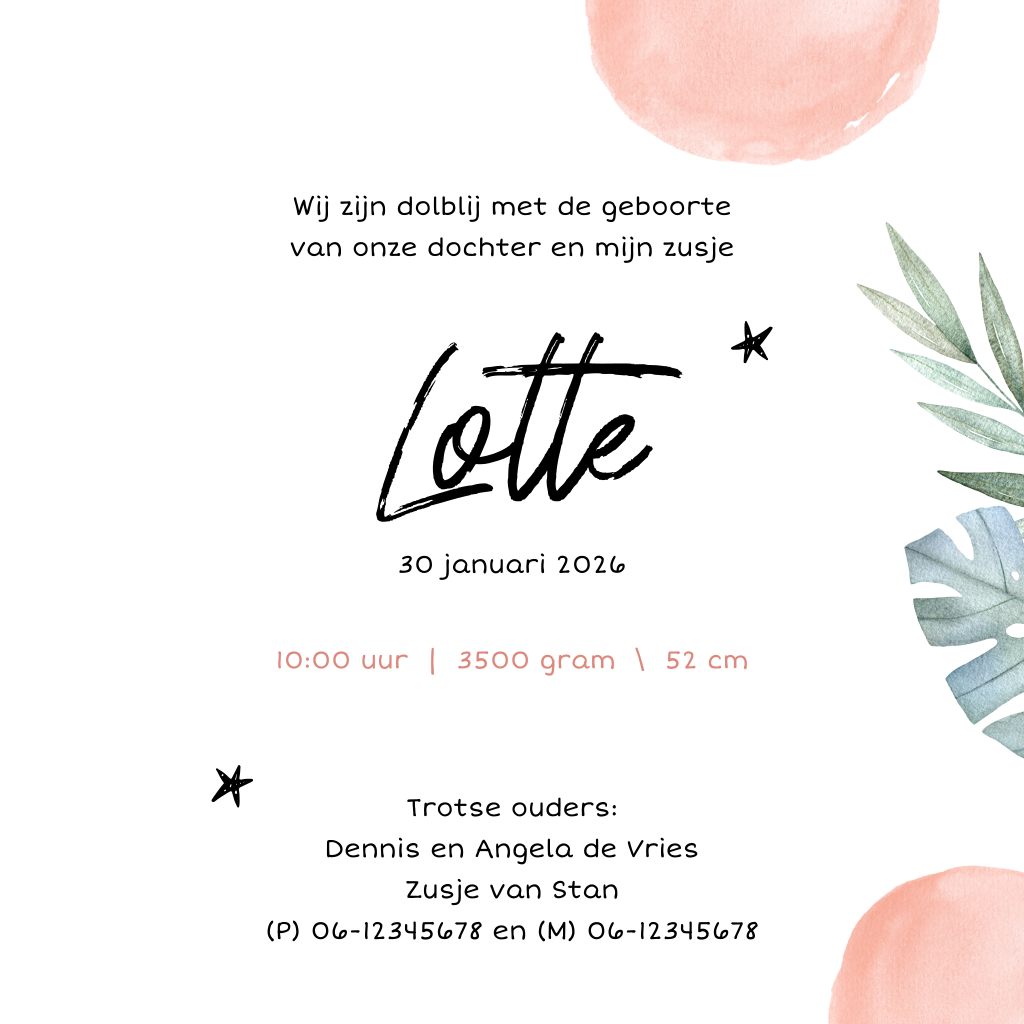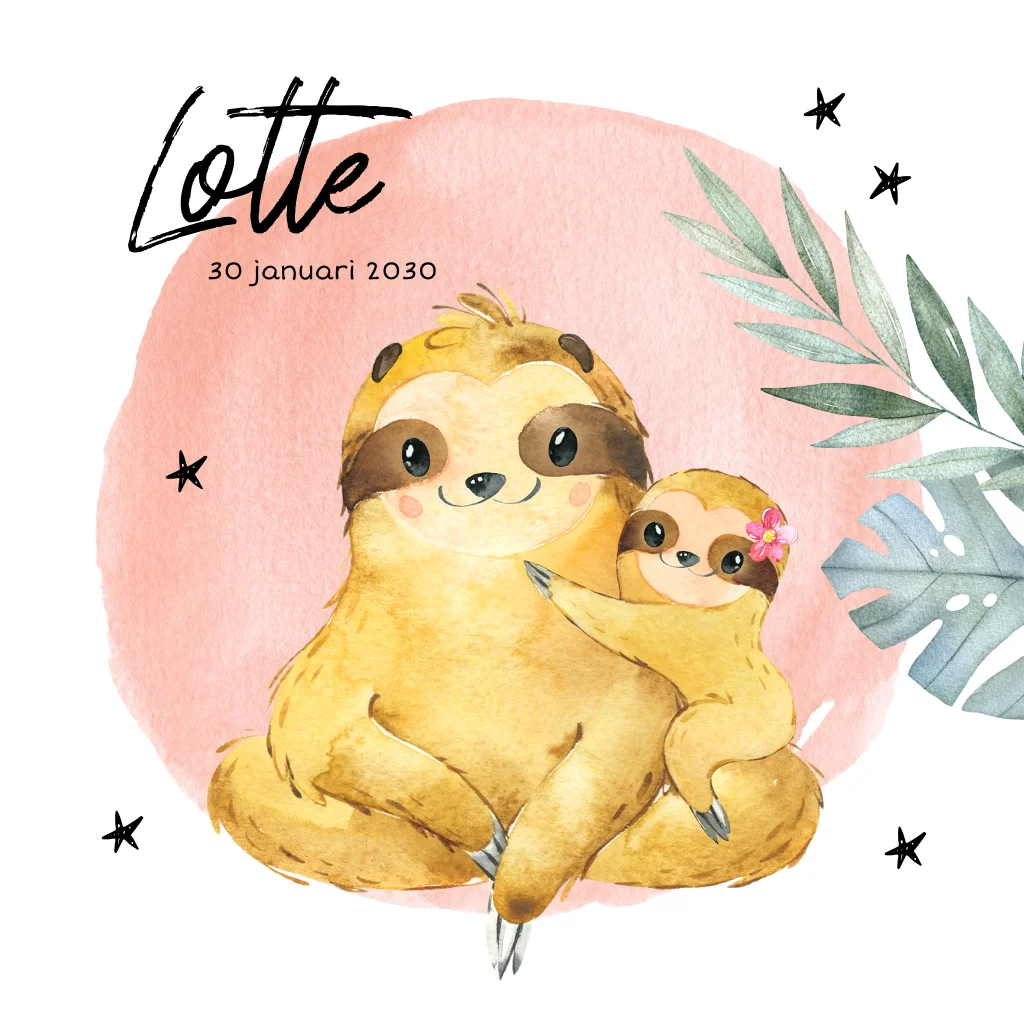 Roze waterverf geboortekaartje met twee luiaards. Op zoek naar een lief geboortekaartje voor de geboorte van je tweede kindje? Kies voor dit vrolijke ontwerp met een grote en kleine luiaard, symbool voor de grote broer met zijn kleine baby zusje. De voorkant heeft stippen van zachtroze aquarel en groene bladeren. Rondom de luiaards dwarrelen sterren. Aan de binnenkant van de kaart kun je een gedichtje of de geboortegegevens plaatsen en keert de illustratie van de baby luiaard terug.
