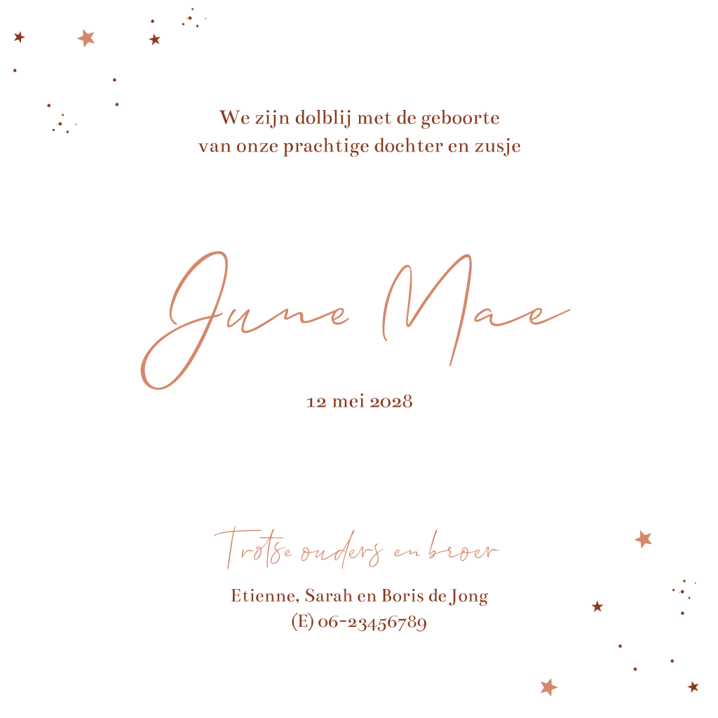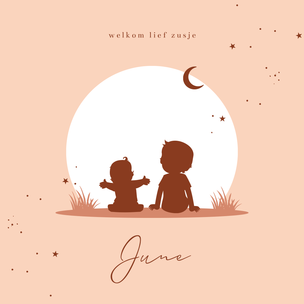 Een ontzettend lief geboortekaartje voor een klein zusje. Haar grote broer staat samen met hem voorop dit zalmroze kaartje voor een tweede kindje. Ze kijken samen naar een zonsondergang, de maan en sterren staan al aan de hemel! Pas gemakkelijk de kleuren aan van dit geboortekaartje in onze editor.