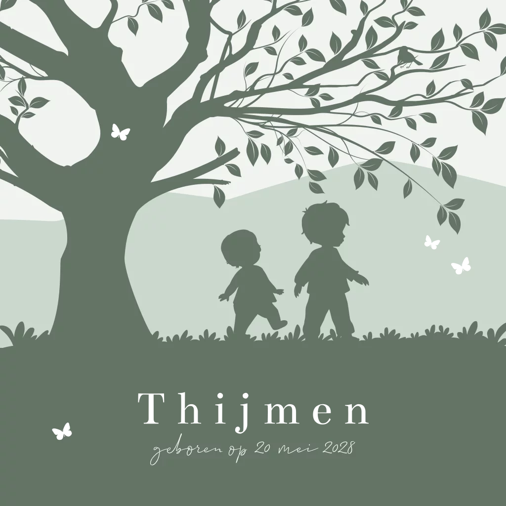 Silhouet geboortekaartje 2e kind: grote broer met jongetje onder boom