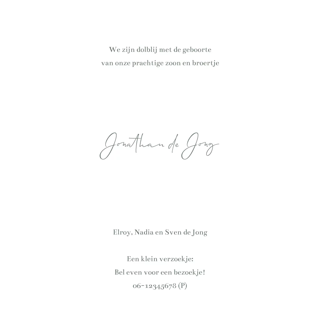 Op zoek naar een leuk geboortekaartje voor een tweede zoon? Ga voor dit lieve silhouet ontwerp met een boom, grote broer en baby jongetje. De naam van je zoontje komt in glimmend goudfolie voorop, evenals de vlindertjes. De kleuren van de illustraties en teksten zijn heel simpel zelf aan te passen in onze ontwerptool. Voeg een eigen foto toe aan de binnenzijde om het kaartje te personaliseren en bestel een proefdruk.