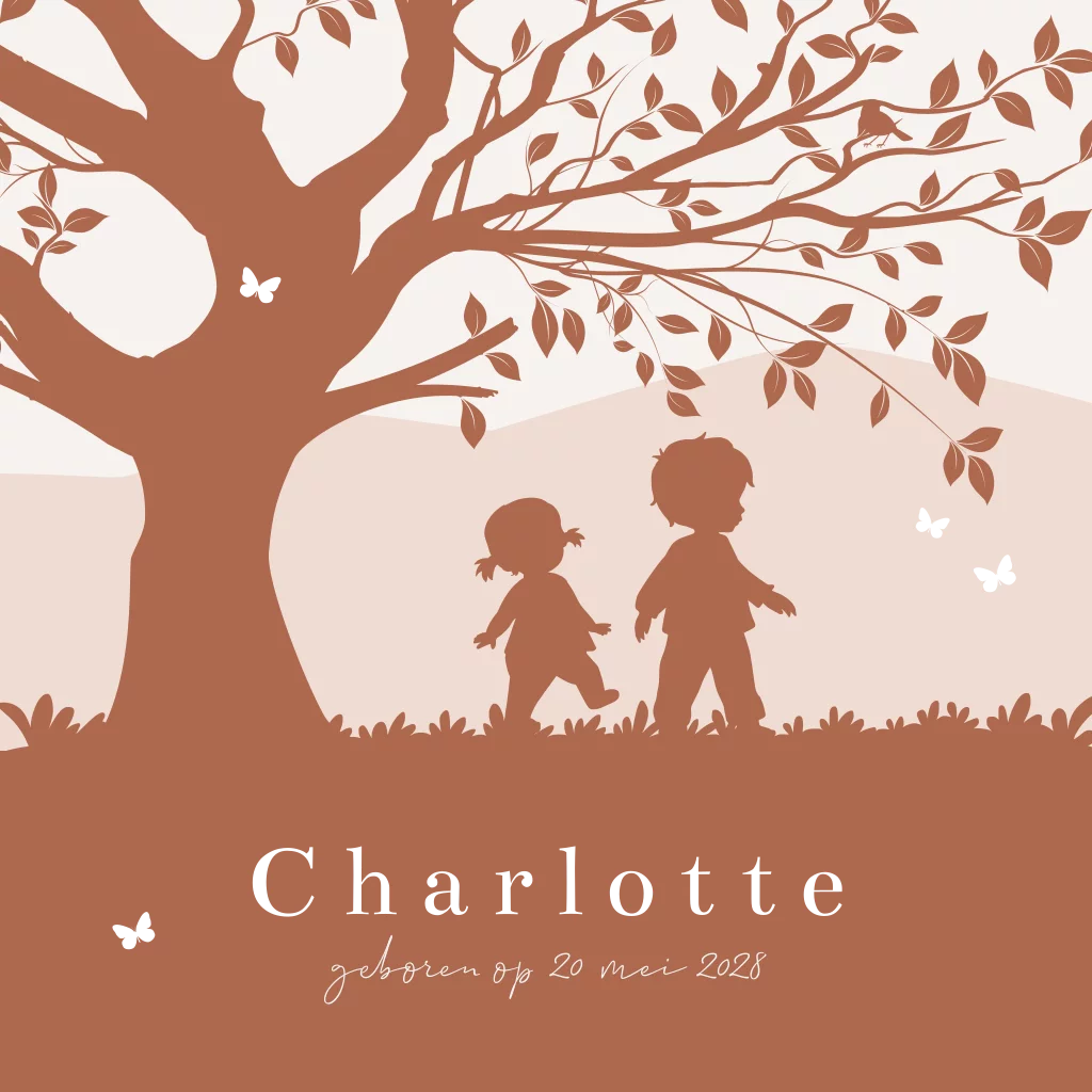 Silhouet geboortekaartje 2e kind: grote broer met meisje onder boom