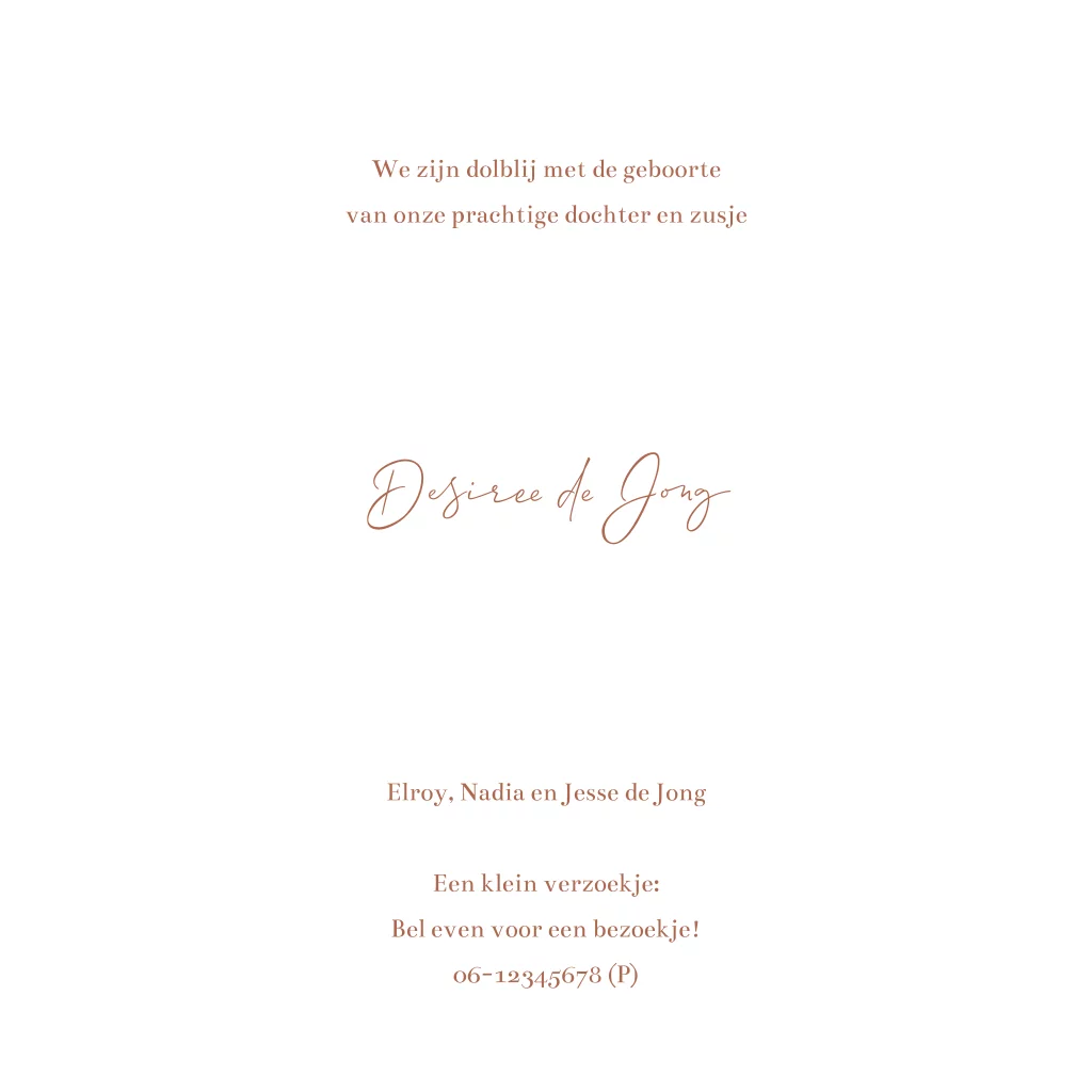 Op zoek naar een schattig geboortekaartje voor je tweede kind? Kies dit lieve silhouetontwerp met een grote boom, grote broer en een lief meisje. De naam van je dochter wordt in glanzende, roségoudfolie gedrukt, evenals de vlindertjes. Pas eenvoudig de kleuren van de illustraties en teksten aan in onze ontwerptool. Voeg een eigen foto toe aan de binnenkant voor een persoonlijk tintje en bestel een proefdruk.