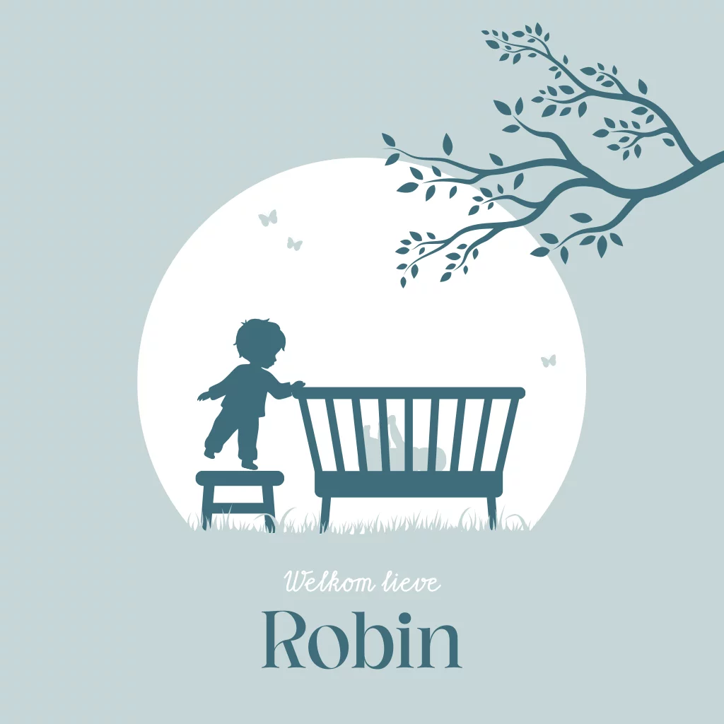 Tweede kindje geboortekaart met twee broertjes in silhouet. Er staat een wiegje in het gras onder een boom met de oudste broer die nieuwsgierig over het randje van de wieg kijkt naar zijn pasgeboren baby broertje. Pas het kaartje naan in de editor en bestel een proefdruk.
