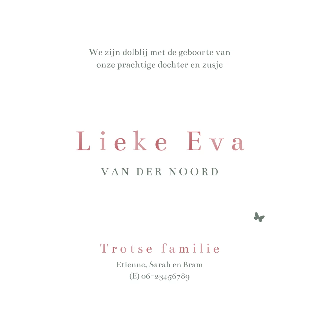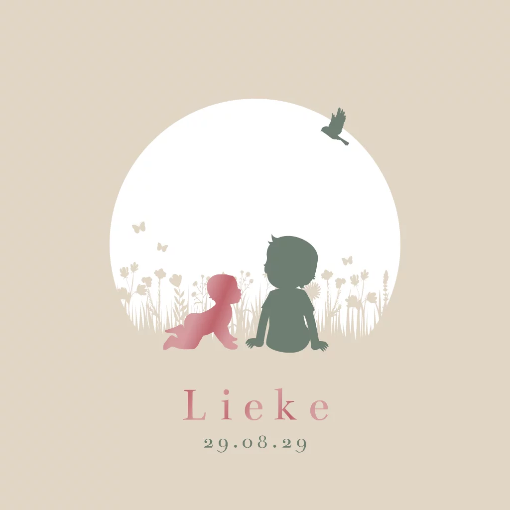 Beige geboortekaartje waar een jongen met zijn kleine zusje zit in een bloemenveld. Wat een mooi ontwerp voor de geboorte van je tweede kind. Het silhouet meisje en haar naam worden in roze hoogglans gedrukt, dit kun je nog aanpassen in de editor. Aan de binnenzijde is er plaats voor alle geboortegegevens. Pas dit kaartje aan in de editor en bestel een proefdruk, zo voorkom je foutjes.
