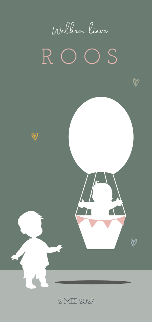 Op zoek naar een silhouet geboortekaartje? voor de geboorte van je tweede kindje? Dan zit je goed! Op dit geboortekaartje staat een broertje die bij een luchtballon met zdaarin ijn kleine zusje. De luchtballon staat op het punt te landen. Pas zelf dit kaartje aan in onze handige ontwerptool en bestel een drukproef om de kaart in het echt te zien.
