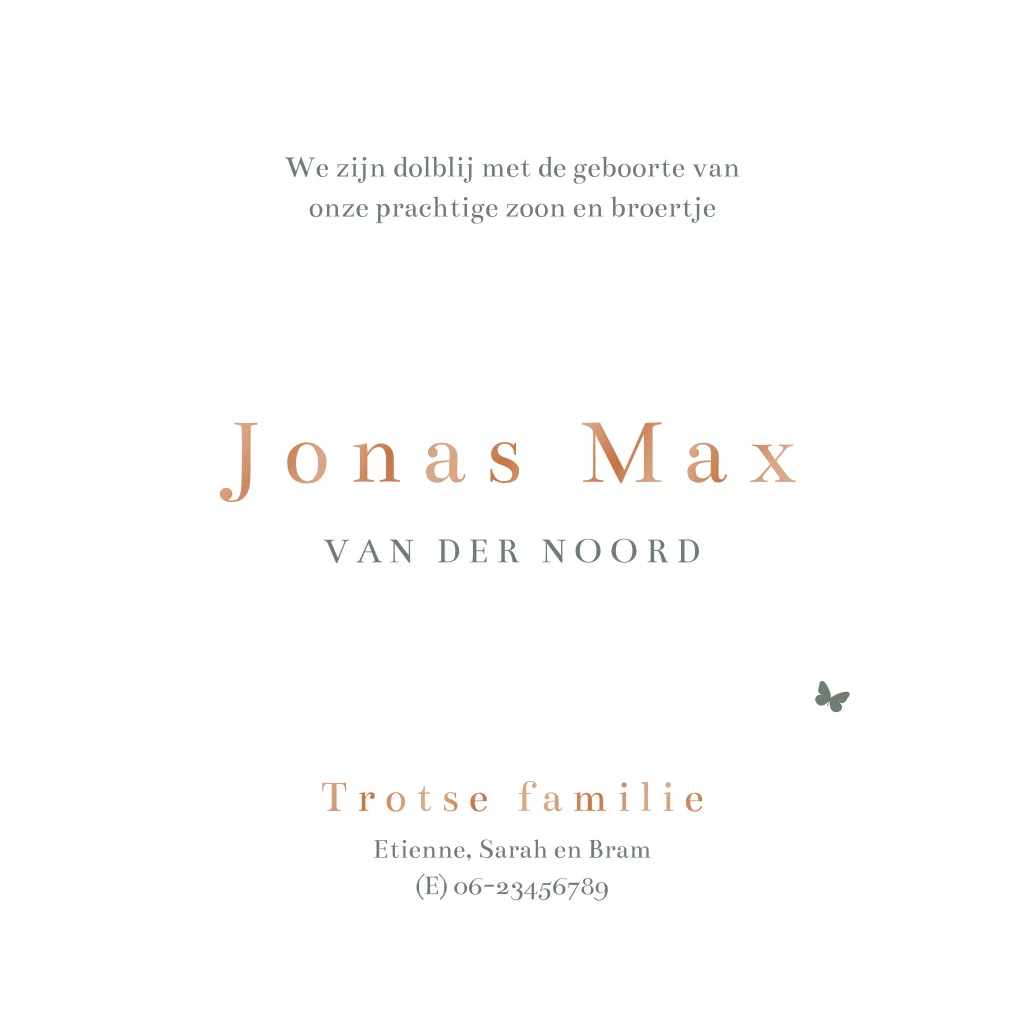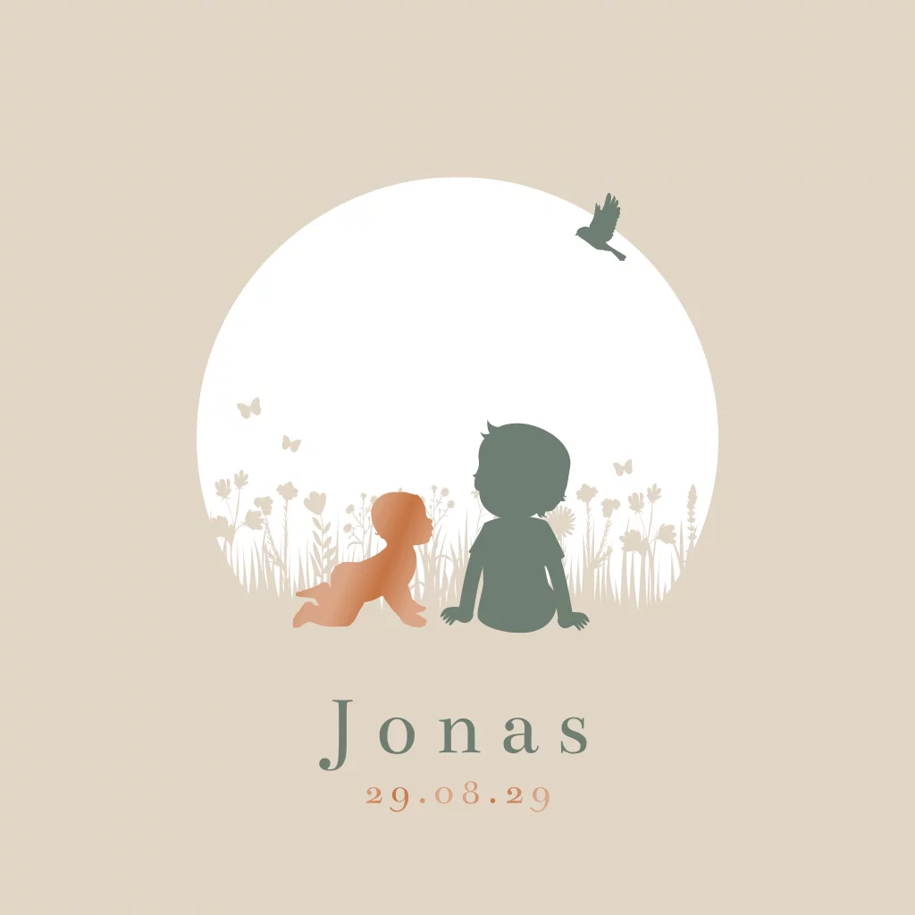 Een jongetje zit in een bloemenveld terwijl zijn kleine broertje eraan komt kruipen. Dit is een prachtig beige geboortekaartje om de komst van je tweede zoontje aan te kondigen. Het silhouet van het jongetje en de geboortedatum worden in roestbruin hoogglans gedrukt. Aan de binnenkant kun je alle tekst kwijt. Personaliseer dit geboortekaartje met silhouetjes eenvoudig in onze editor en bestel een proefdruk.