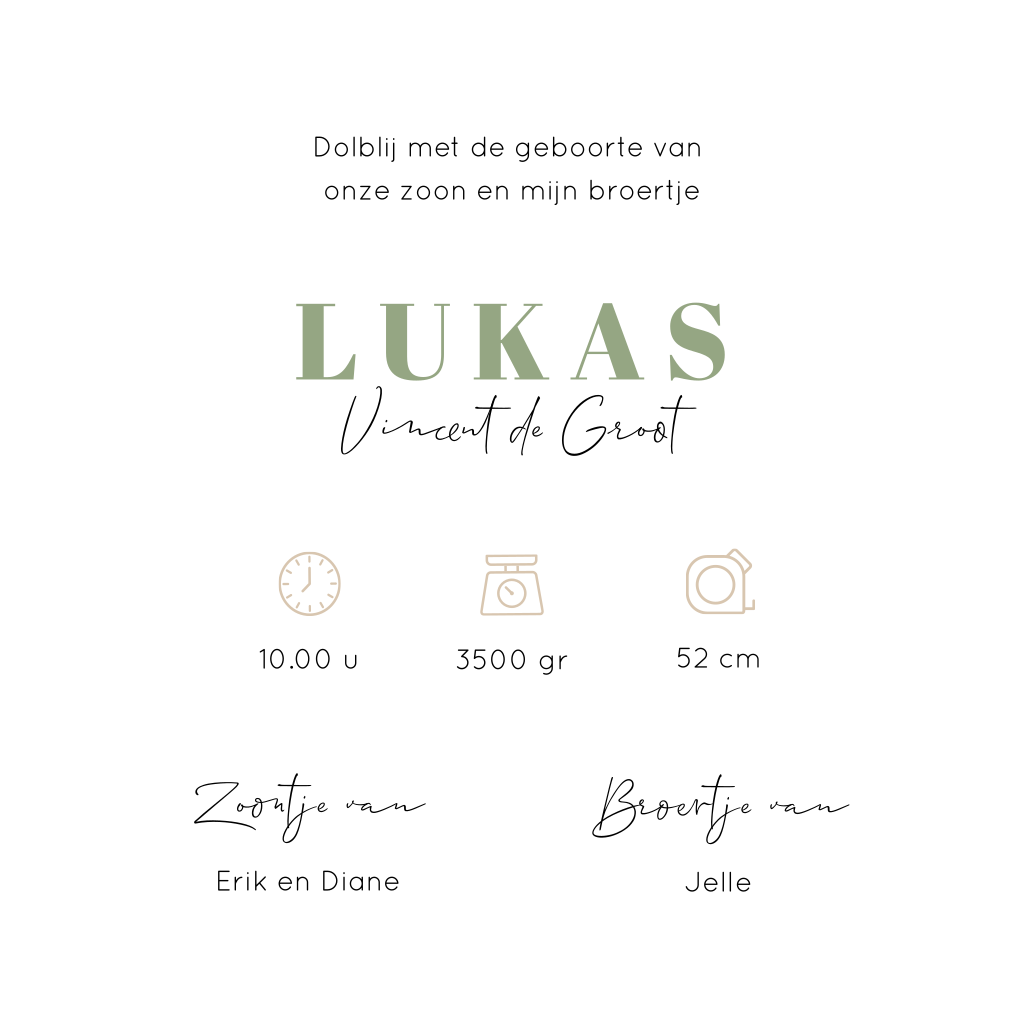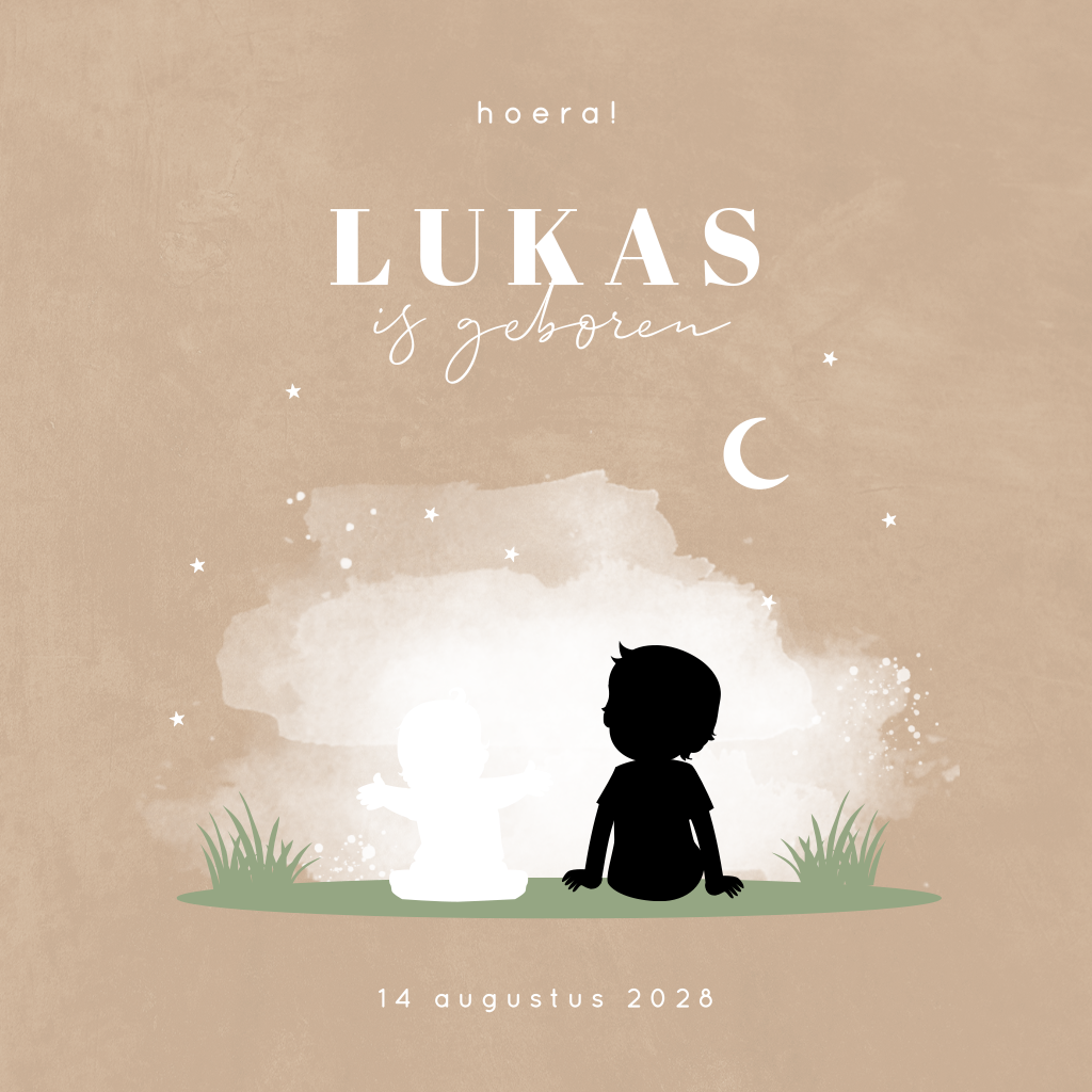 Een mooi geboortekaartje voor een tweede kindje in zandkleur met hoogglans zwarte silhouetjes. Pas zelf de silhouetjes aan in onze ontwerptool, kijk in de afbeeldingenmap 'Silhouet familie' voor tientallen broertjes en zusjes. Aan de binnenzijde is ruimte voor een kort gedichtje of lieve quote en alle geboortegegevens van de kleine.