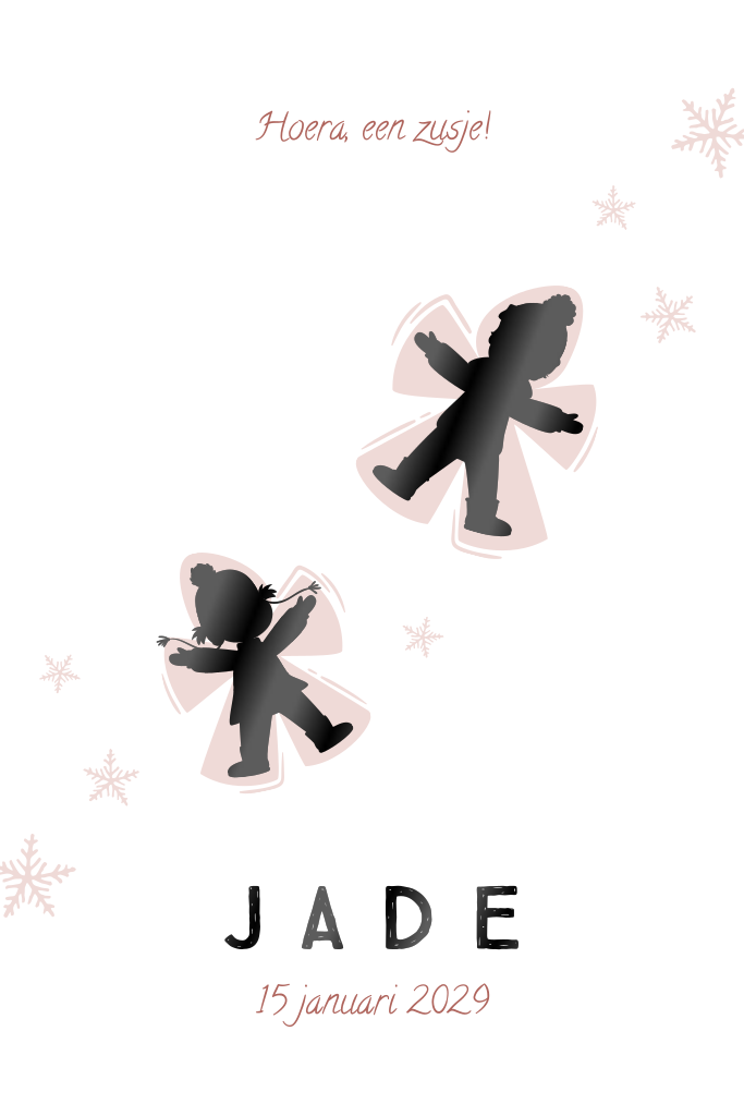 Twee kindjes spelen samen in de sneeuw op dit vrolijke en winterse geboortekaartje voor een tweede kindje. Wordt jouw dochtertje in de wintermaanden geboren? En zoek je een leuk kaartje waar grote broer op naar voren komt? Dan is dit geboortekaartje met twee hoogglans silhouetjes perfect! De broer en zus maken allebei een sneeuwengel en om hun heen dwarrelen sneeuwsterren. De silhouetjes en naam van je dochtertje worden in hoogglans zwart gedrukt voor een extra bijzonder effect. Pas deze kaart zelf aan in onze editor.