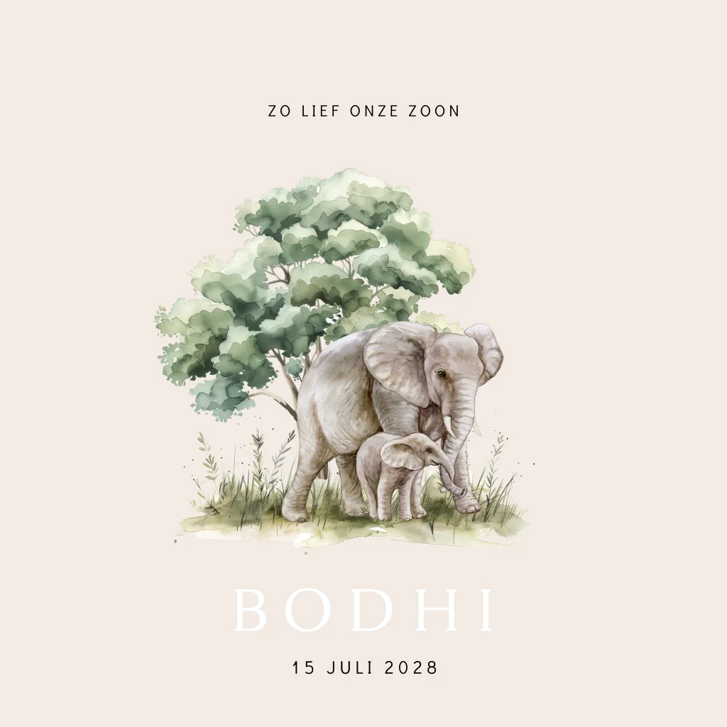Beige geboortekaartje met waterverf illustratie van een moeder olifant met een baby olifant en de naam in mooi koperfolie. Dit stoere geboortekaartje kan zowel voor de geboorte van een jongen als een meisje. Bestel snel een proefdruk om dit kaartje in het echt te zien!