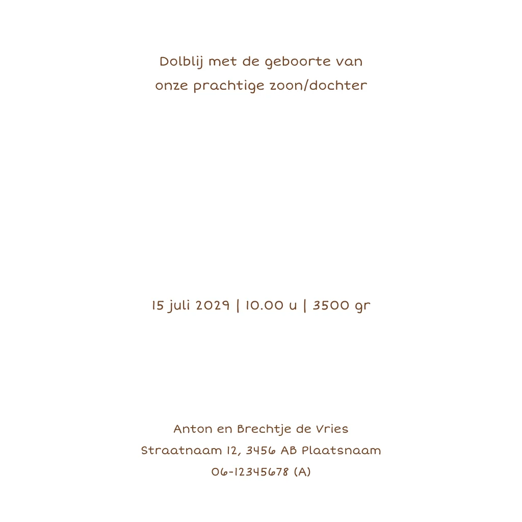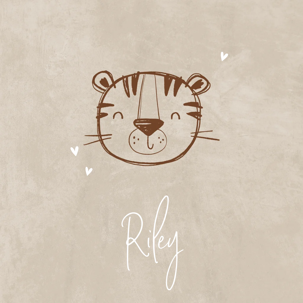 Stoer geboortekaartje geschikt voor zowel jongens als meisjes, met een subtiele tekening van een tijger in het midden. De naam is prachtig gedrukt in glanzende koperfolie. Aan de binnenzijde is ruimte voor een lief gedichtje of mooie quote. Pas dit leuke ontwerp naar eigen smaak aan in onze editor.