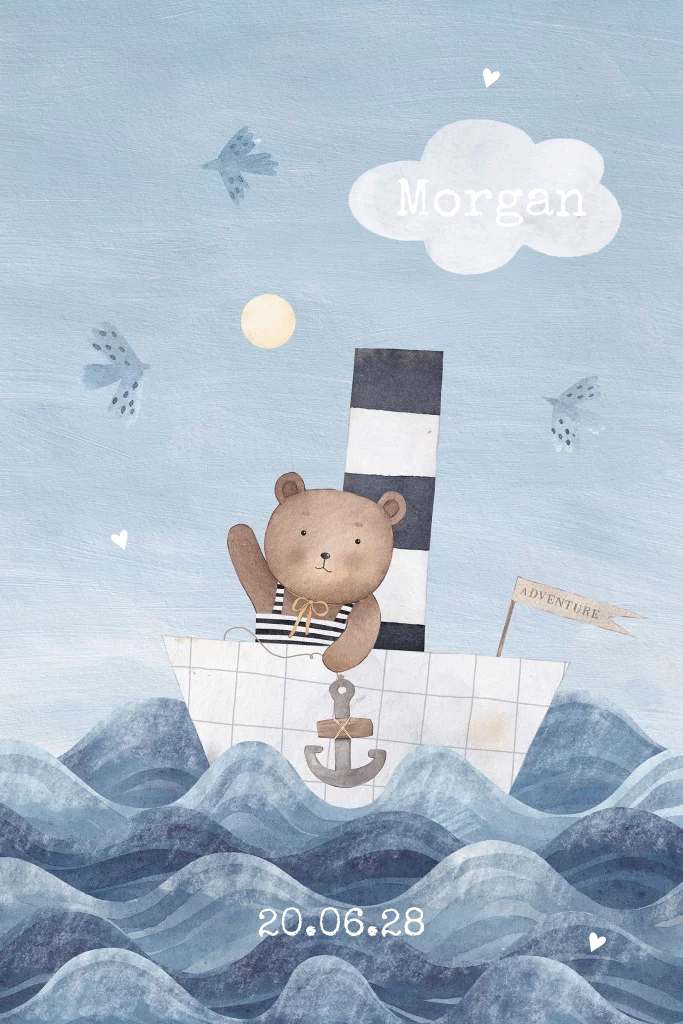 Dit geboortekaartje voor een jongen heeft een maritiem thema, perfect voor ouders die aan de kust wonen of graag zeilen. Het kaartje toont een lieve teddybeer in een gestreept matrozenpakje die vrolijk zwaait vanaf zijn schip. Het schip deint over blauw-getinte golven. Boven het schip vliegen vogels door de lucht, en de naam van de baby schittert in goudfolie op een wolkje.